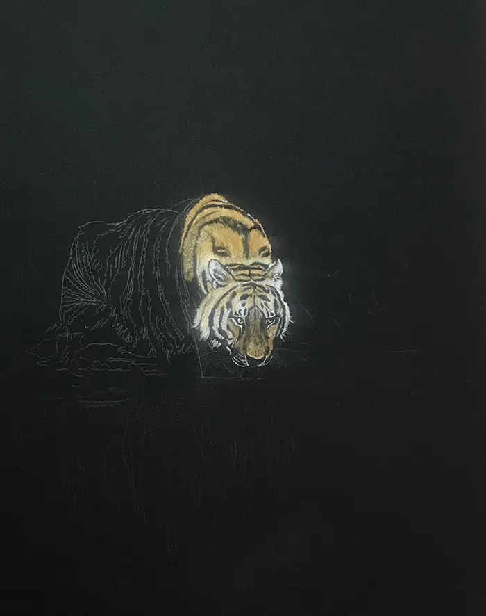 I've started with a light sketch in chalk of the tiger drinking on a black background