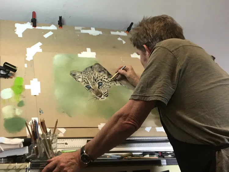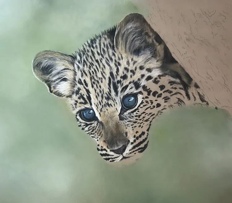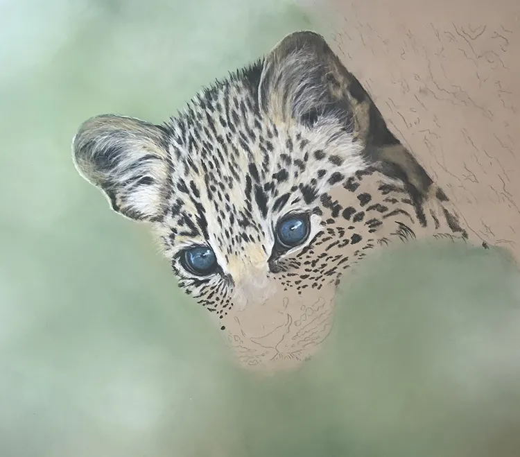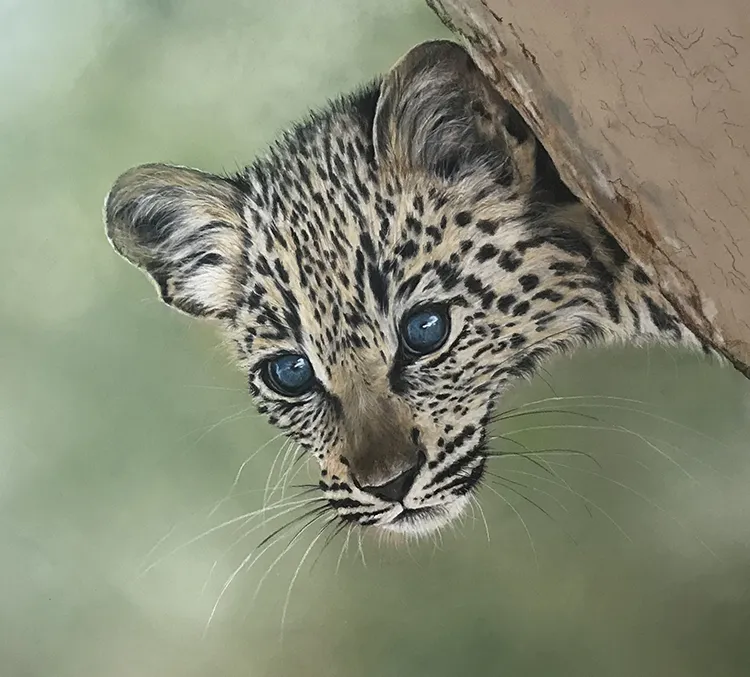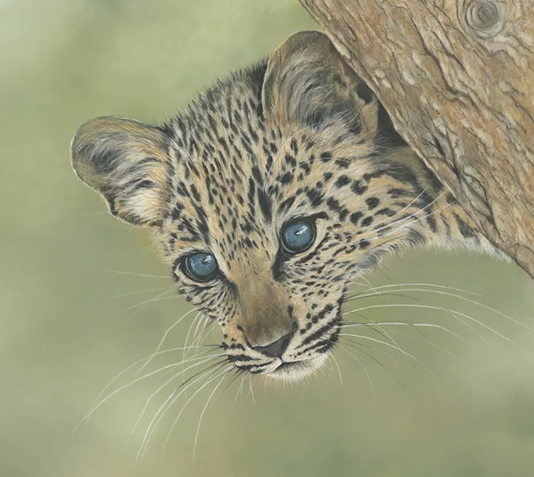 This is a painting of a very young leopard cub peeping from behind a tree trunk. The blueness of its eyes is due to the small deposit of melanin in the irises, which are the muscular rings around the pupils, making them appear blue.