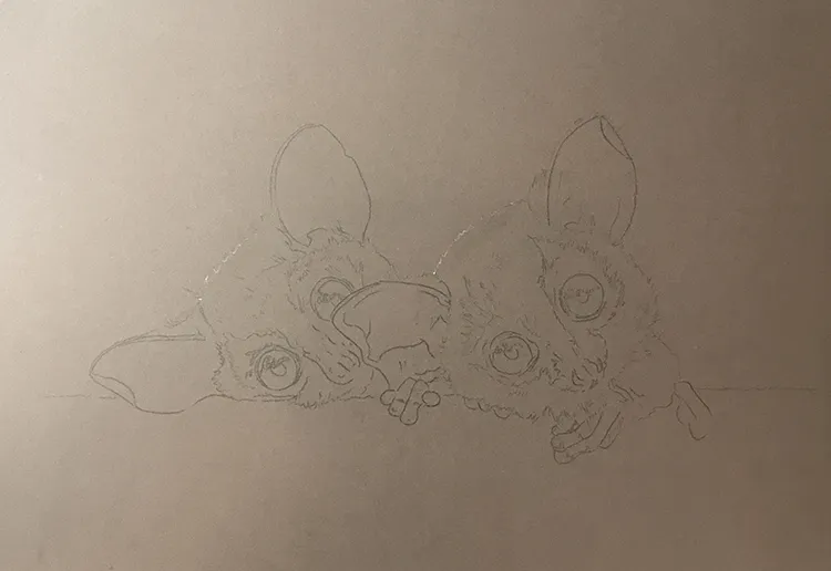 I've lightly sketched in the two inquisitive little bushbabies peering over a branch