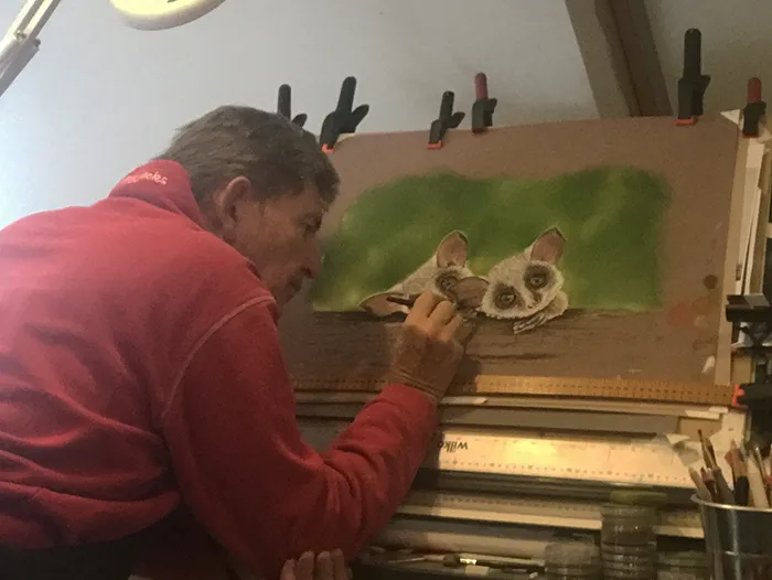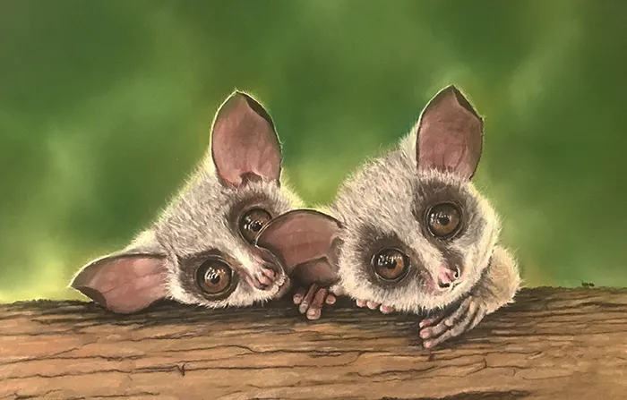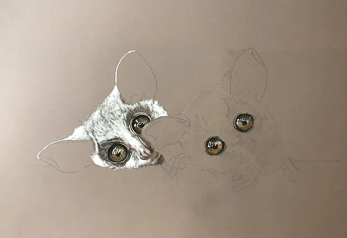 I started on their big eyes and then I've worked on the first bushbaby adding its large ears