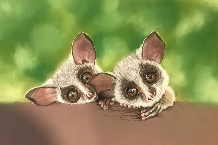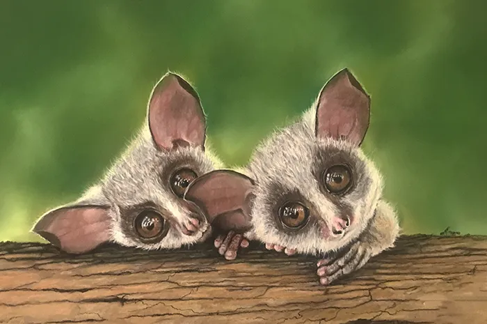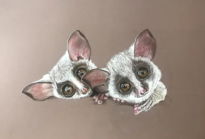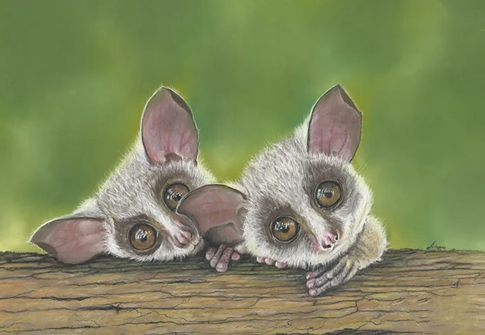 This image of two young bush babies has been sketched in the medium of Pastel on a PastelMat paper whilst using a series of beautiful photographs courtesy of Dustin Van Helsdingen.