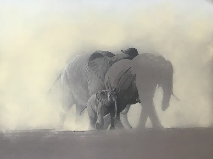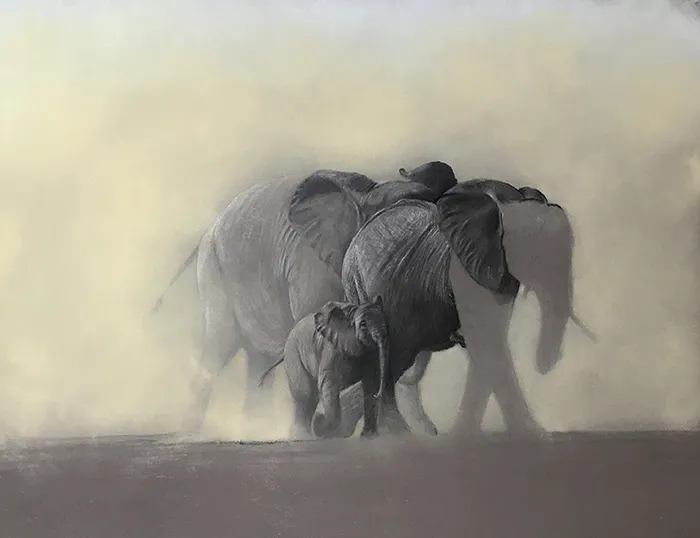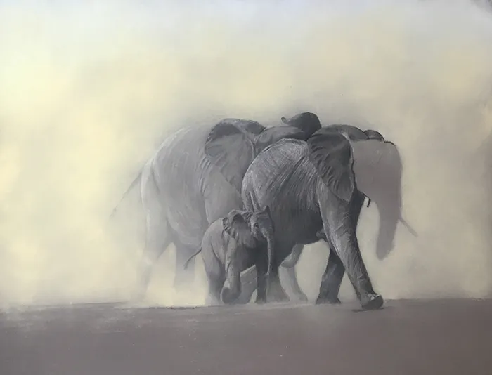 I'm at my easel working on some minor highlights on the baby elephants trunk