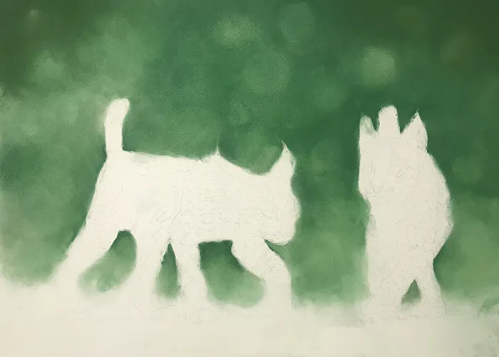 I've added a dappled background and then started on the tail & ears of the right kitten