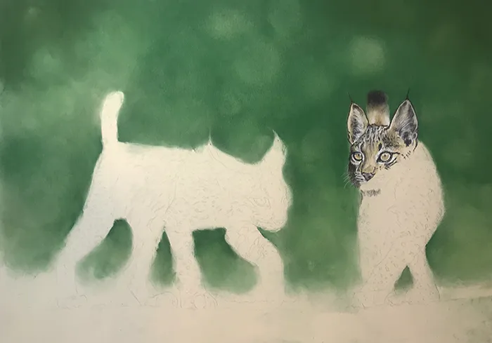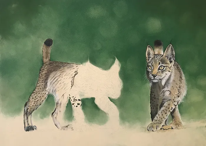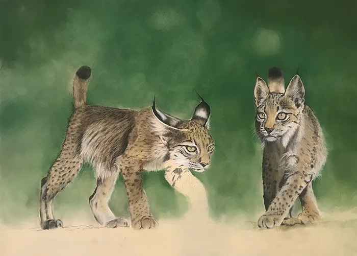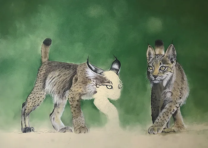 This ia a sketch of two Iberian Lynx kittens looking for trouble. It's been sketched using the medium of pastel on pastel paper whilst using a series of beautiful reference photographs taken by Ayala Fishaimer.