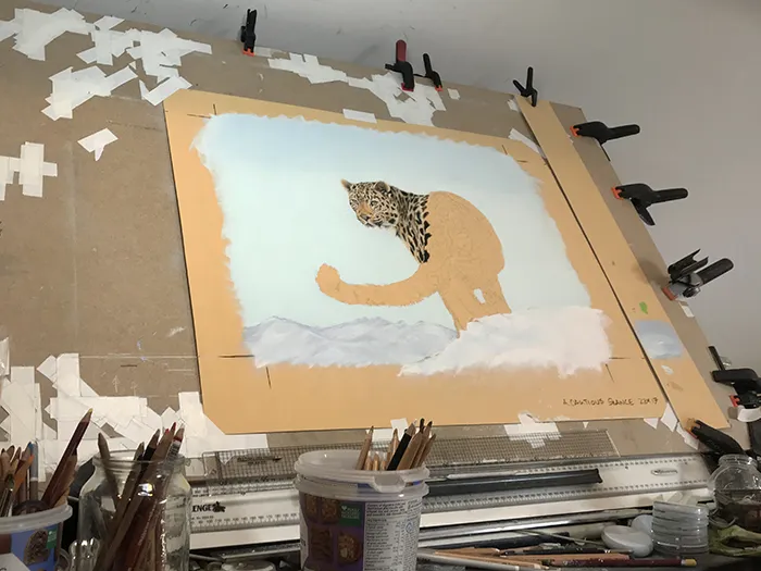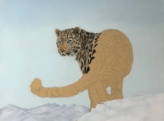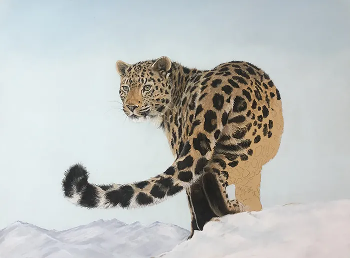The Amur leopard is one of the rarest and most critically threatened leopard subspecies which is found along the borderlines of Russia and China. This image was sketched using Pastel on a Pastelmatt paper whilst referencing a beautiful photograph curtesy of wildlife photographer Matthew Roper.