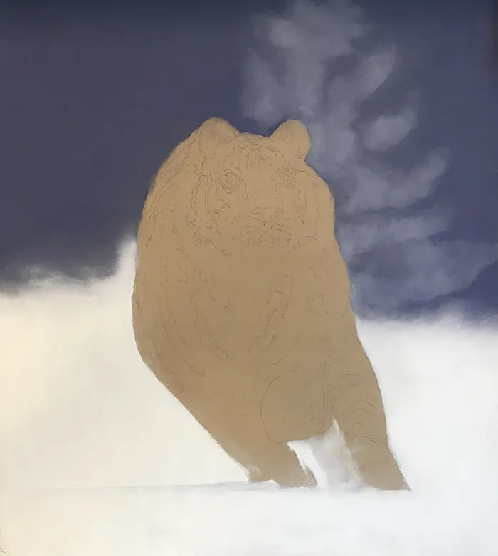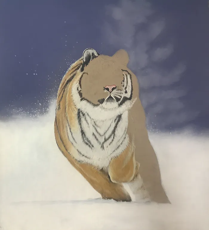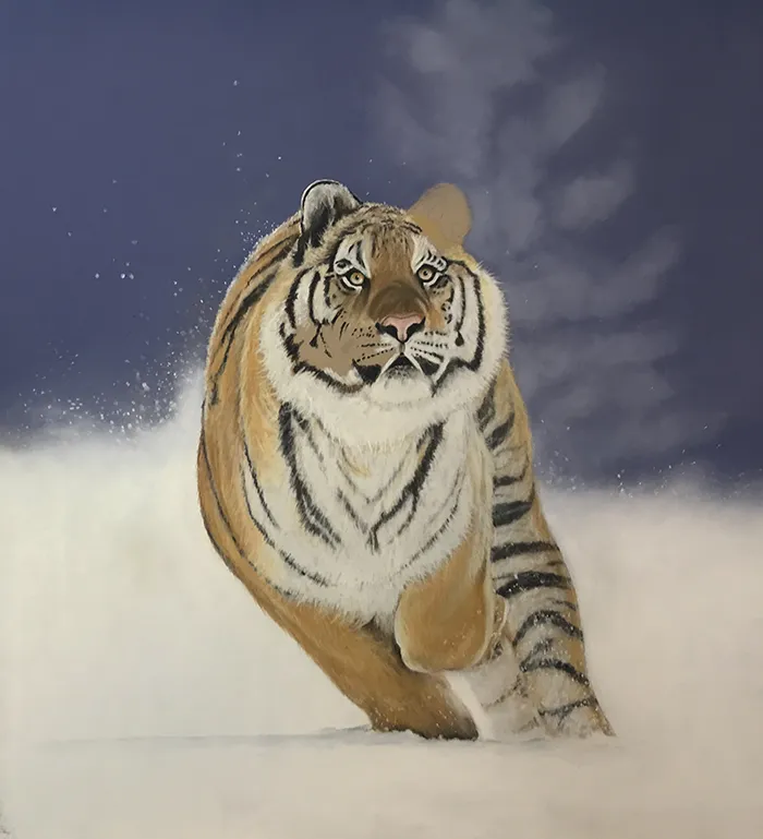 This image of an Amur Tiger exploding into a sudden charge has been sketched using the medium of soft and hard Pastels on a PastelMat paper.