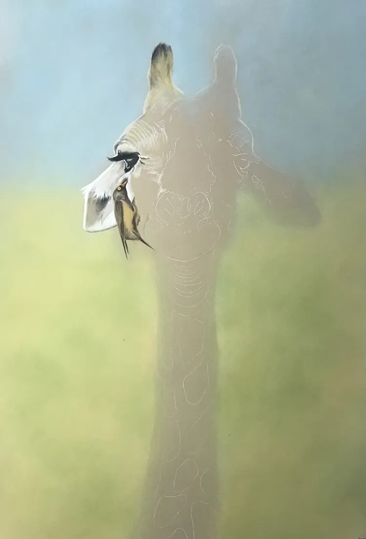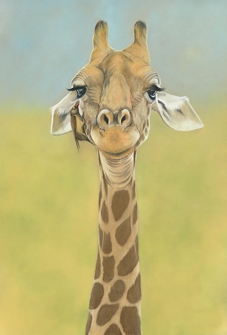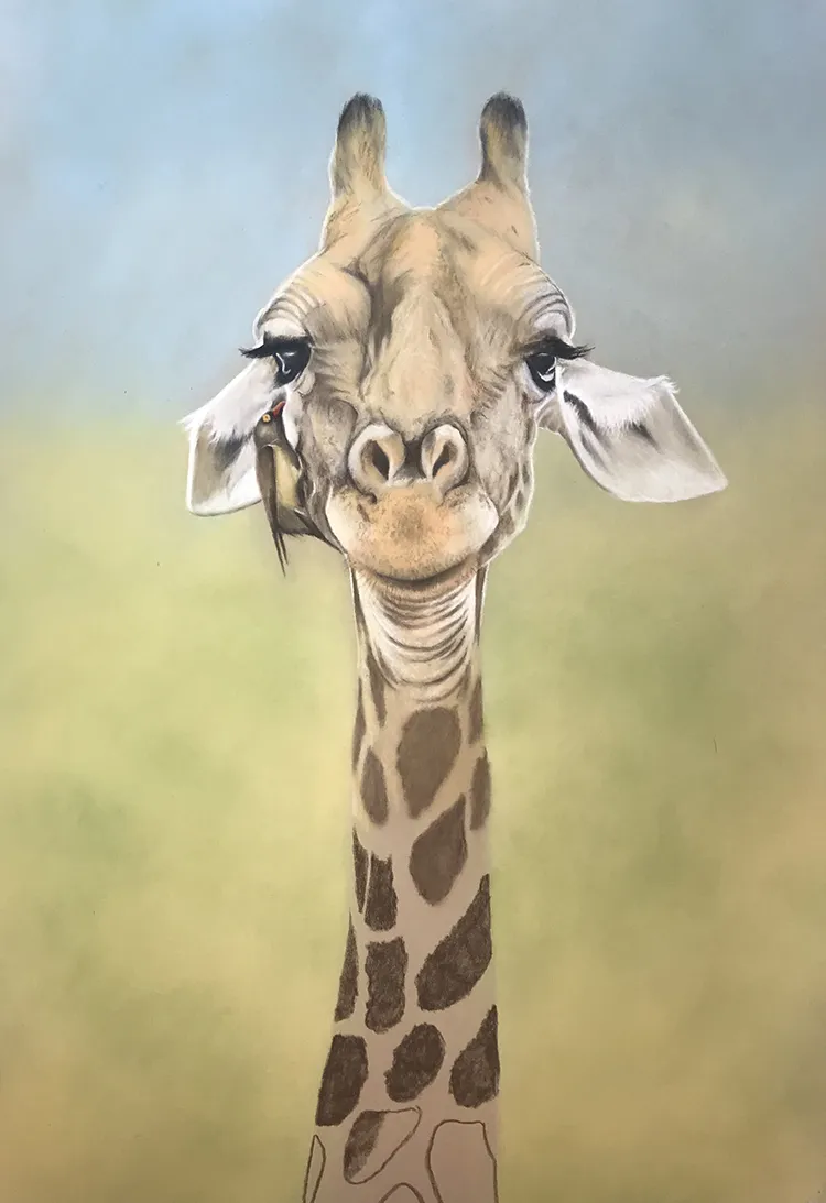 Working down the neck as I add the dappled colours, with the giraffe beginning to stand out from the background