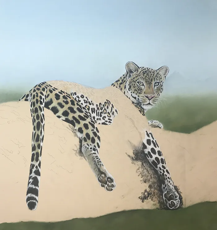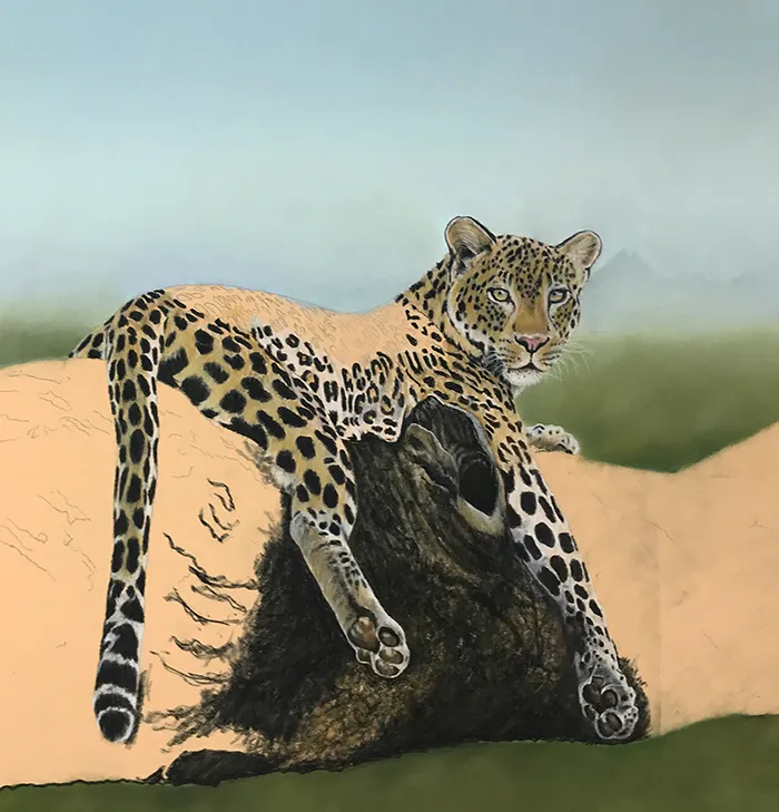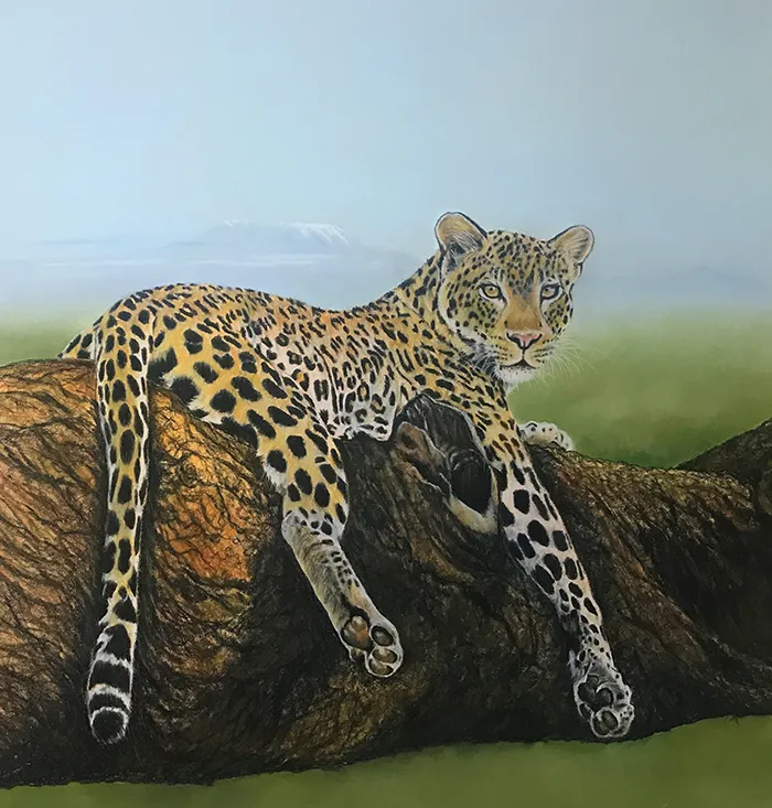 This image of a leopard reclined on a large branch with Mt Kilimanjaro in the background has been sketched in the medium of Pastels on a PastelMat paper whilst using a beautiful photograph courtesy of Tina Marie