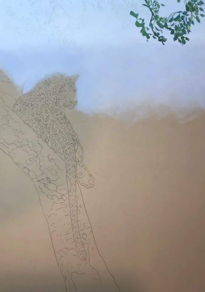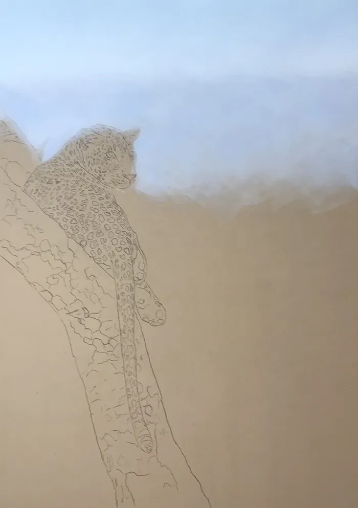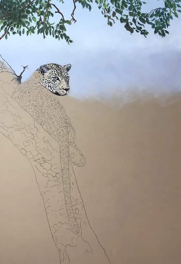 I've started by adding a light sketch of the leopard that's relaxed in the fork of the tree