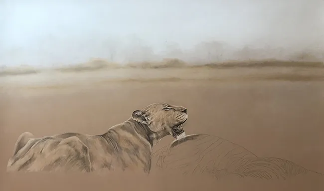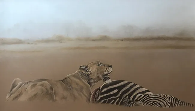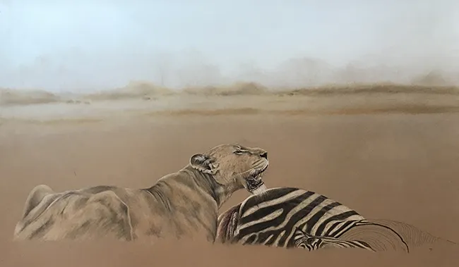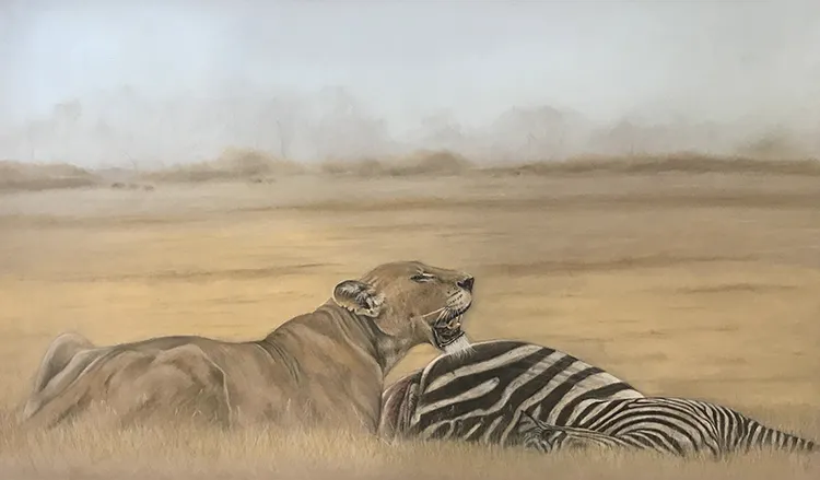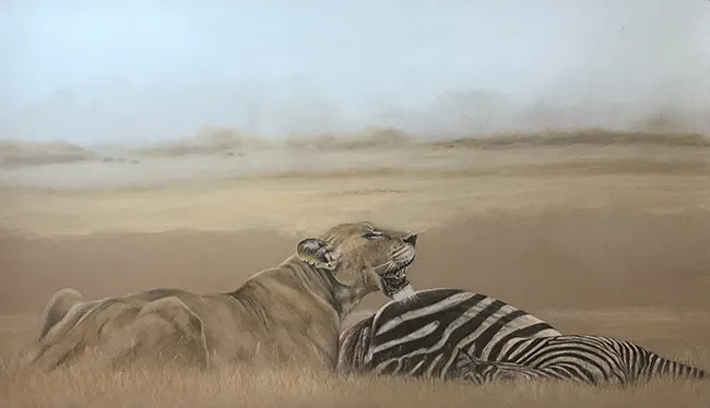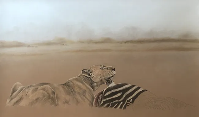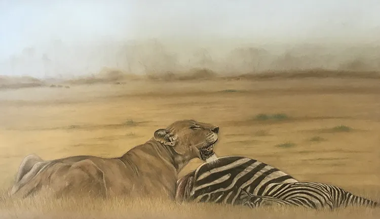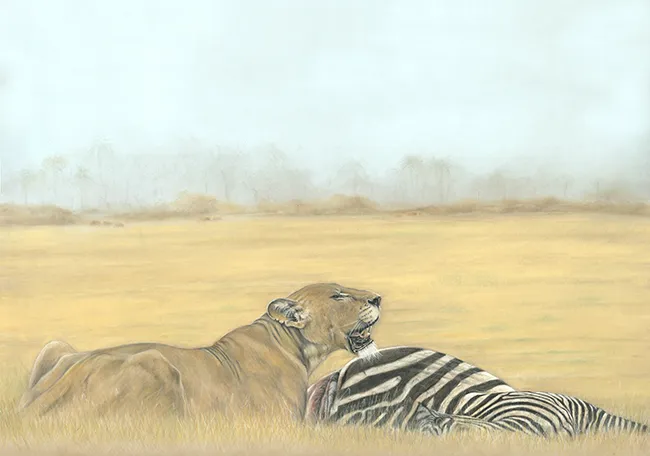 I have sketched this scene of a lioness taking a breather at a zebra kill using PASTELS on PASTEL MATT paper whilst using a beautiful reference photograph courtesy of Tim Nicklin