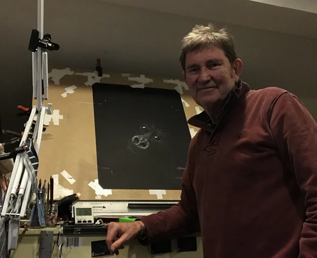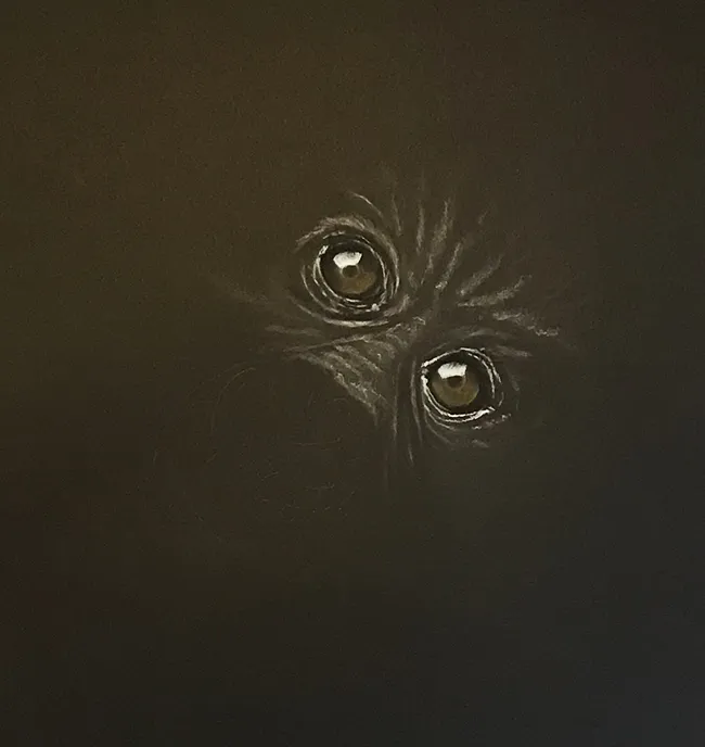 I have reversed the sketch and have put more detail in the eyes. It has been sketched using the medium of Chalk, Charcoal with a little Ochre in its eyes on black pastel paper.
