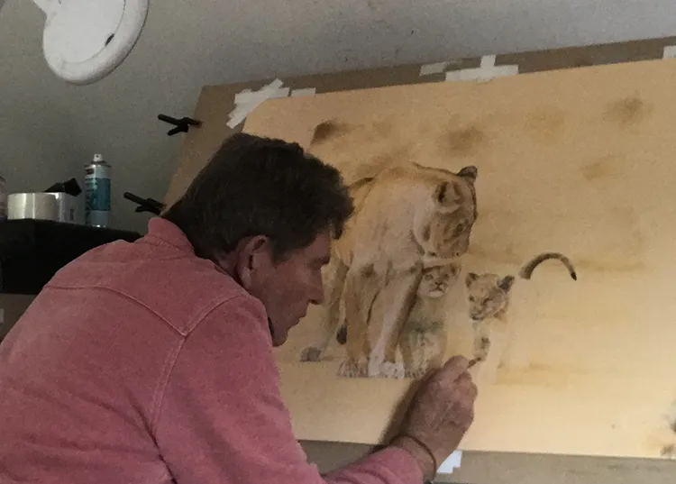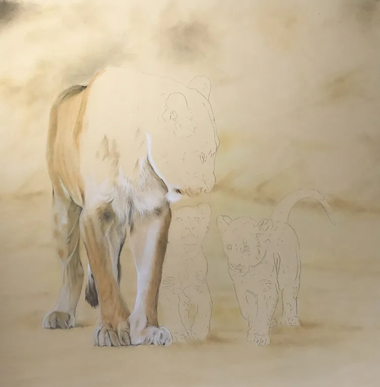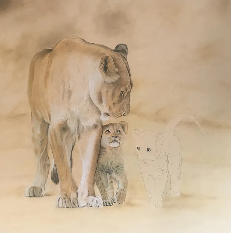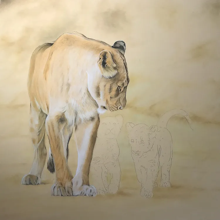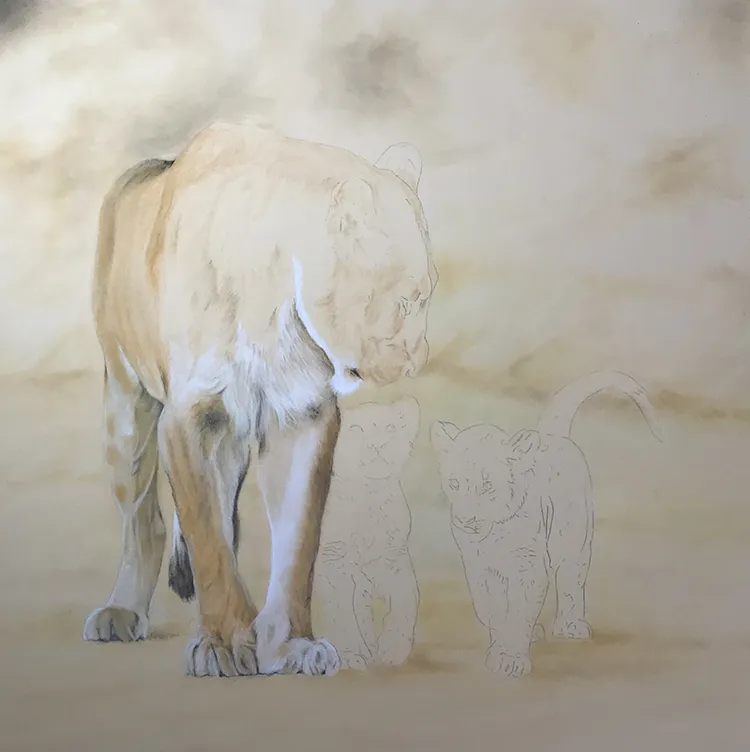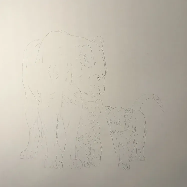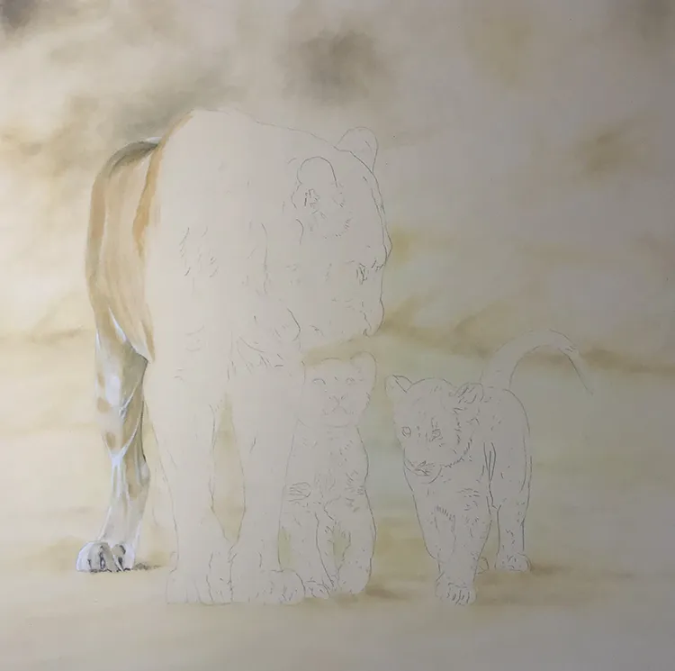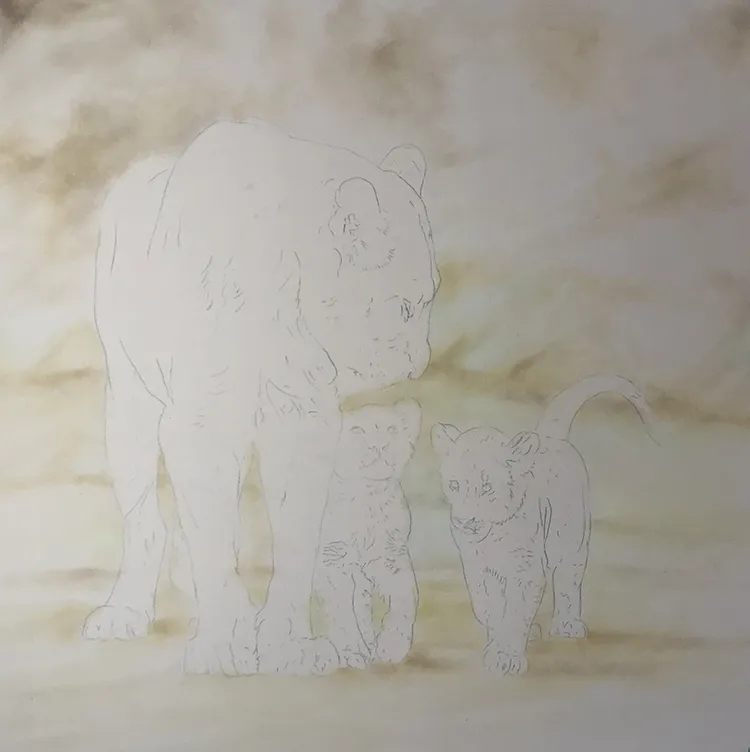 I've started by sketching in the lioness outline with her two cubs before working on the background