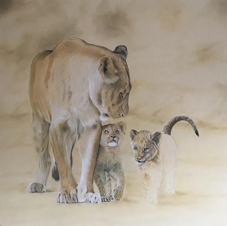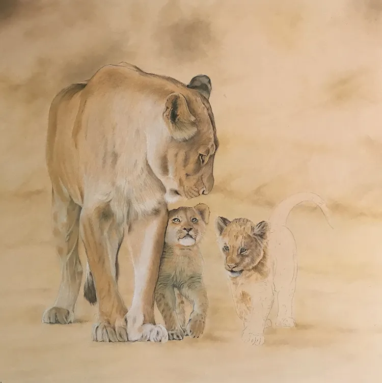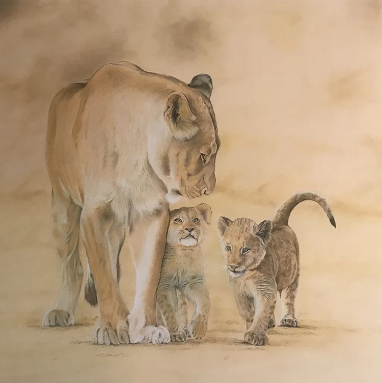 This is an image of a lioness and two of her cubs It has been sketched using PASTELS on Pastel Matt Paper whilst using two excellent reference photographs courtesy of wildlife photographer Andrew Taylor.