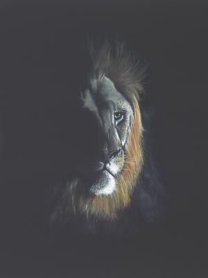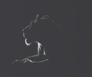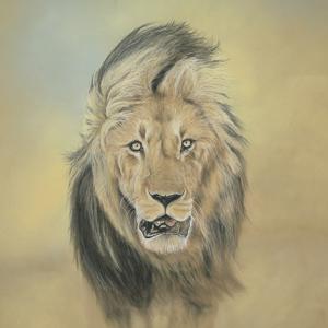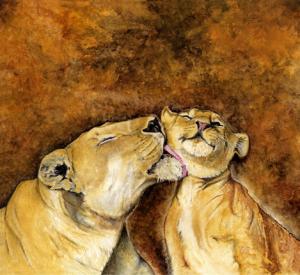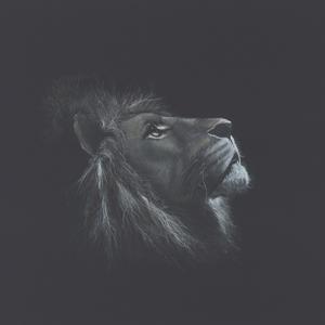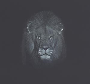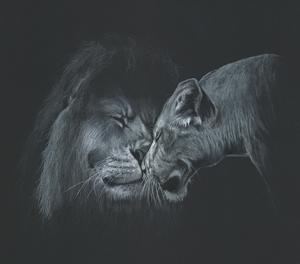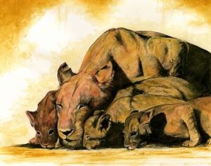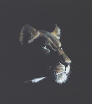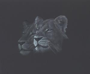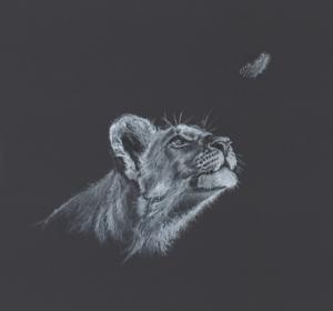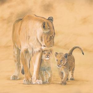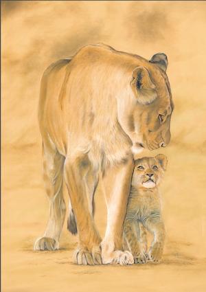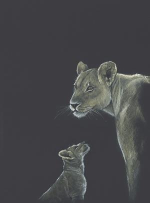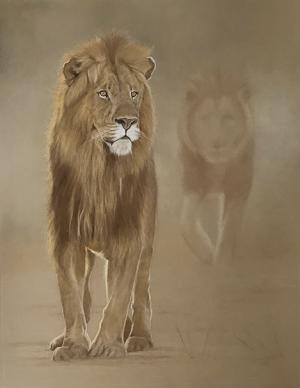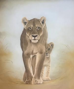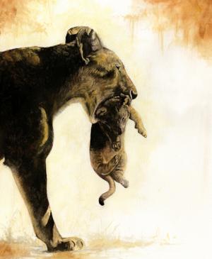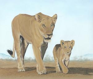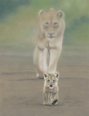 A lion cub tentatively follows in it's mother's footsteps down a track on a misty morning