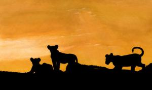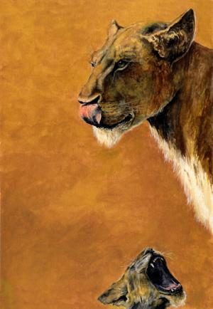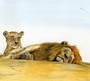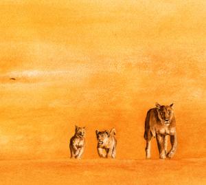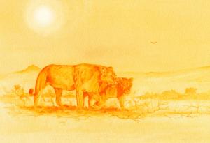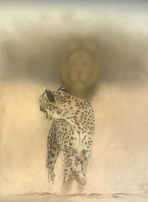 A female cheetah looks back over her shoulder as a large male lion follows her in the shimmering heat