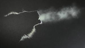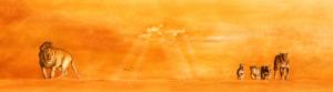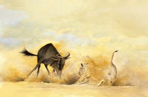 A lioness begins an attack on a herd of zebra as they stampede through dust