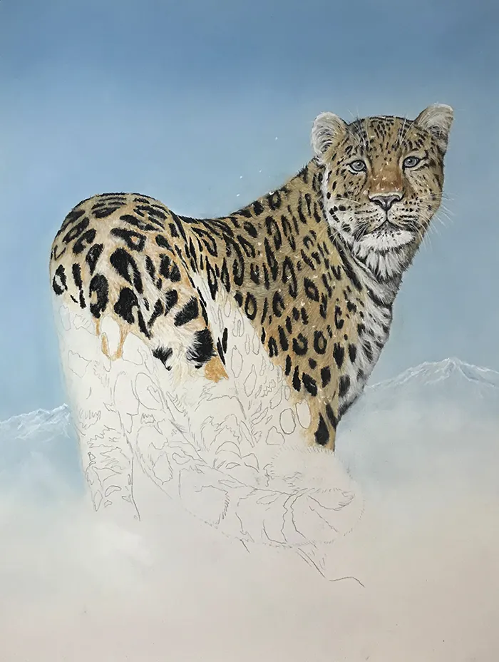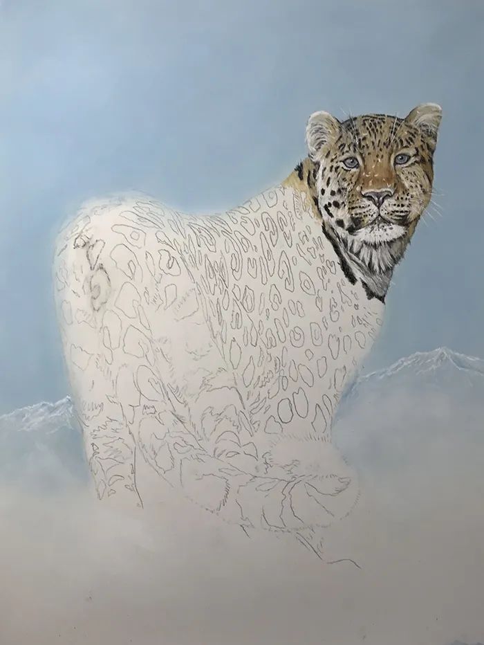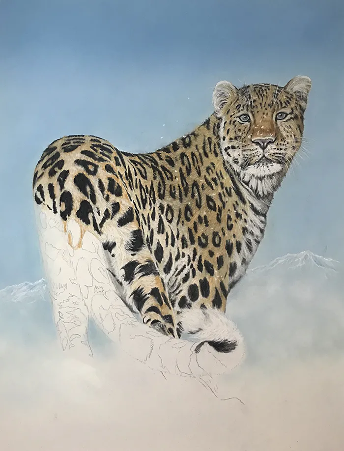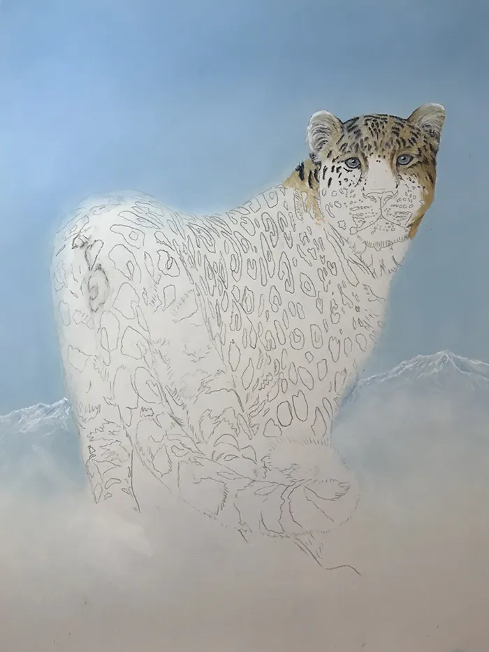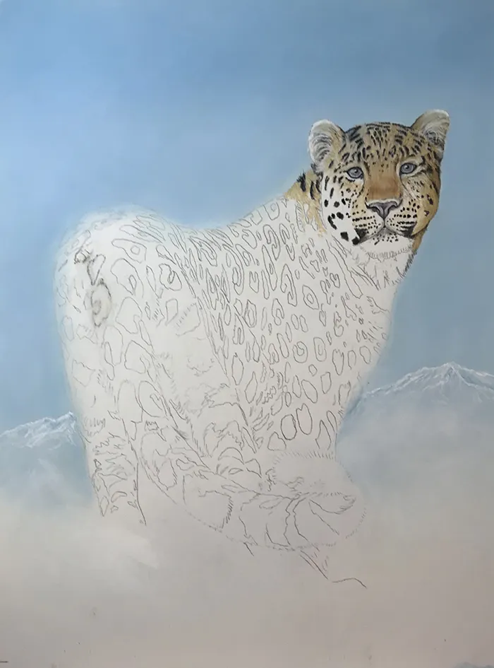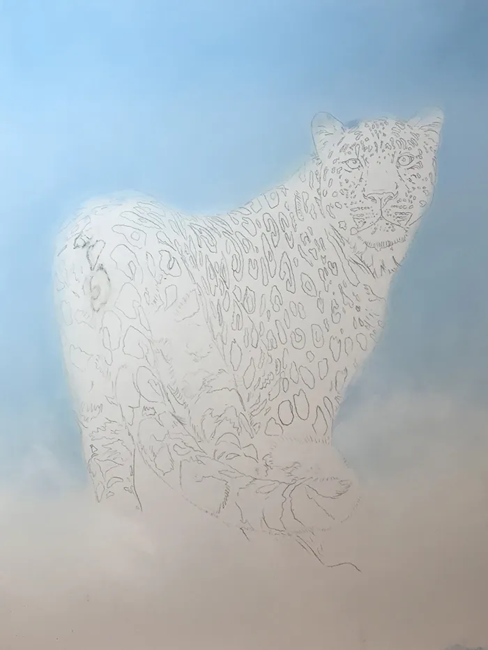 I've lightly sketched in the leopard, adding a PanPastel blue tint as a base for the background