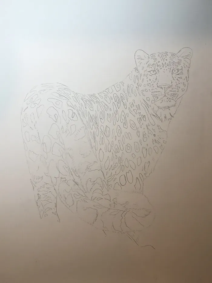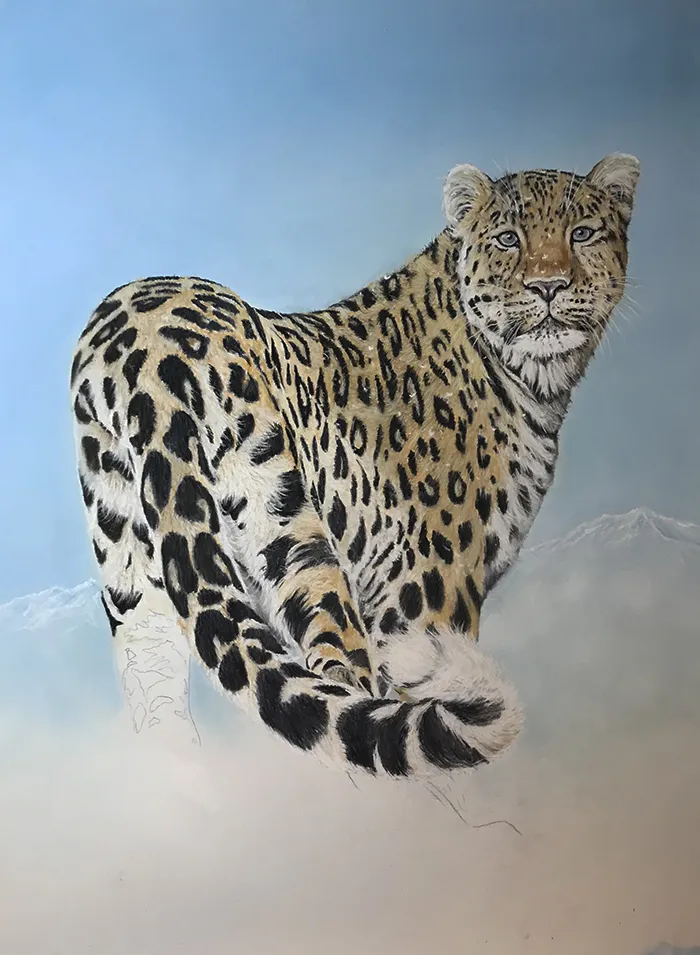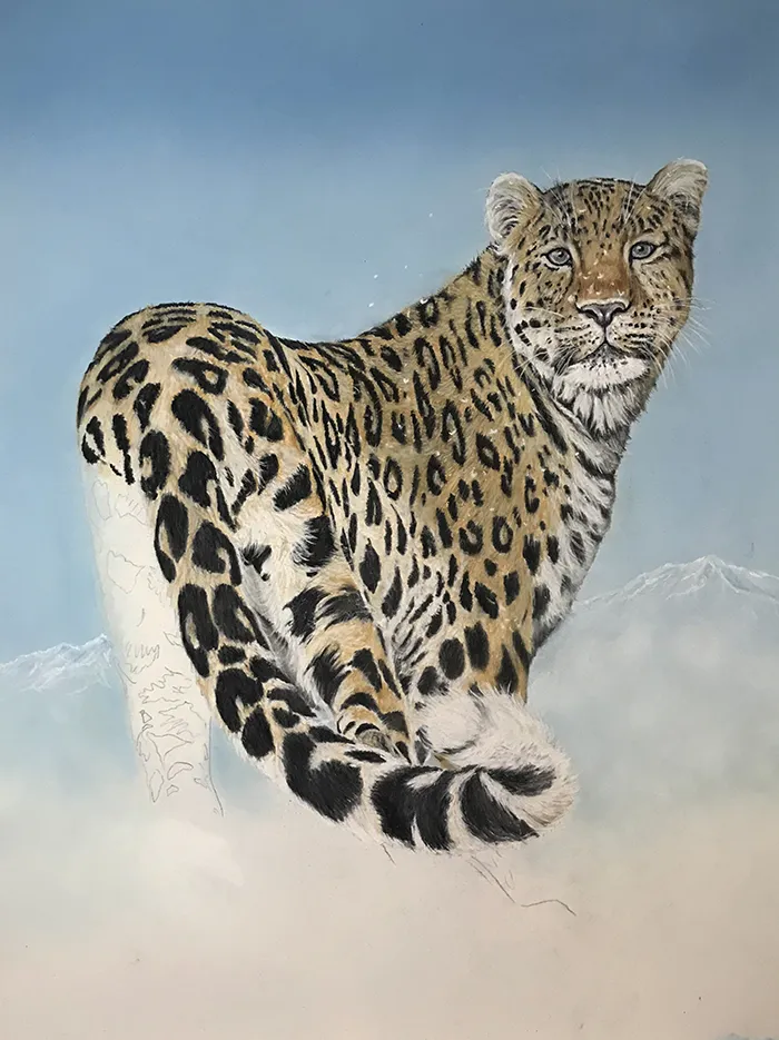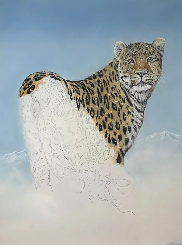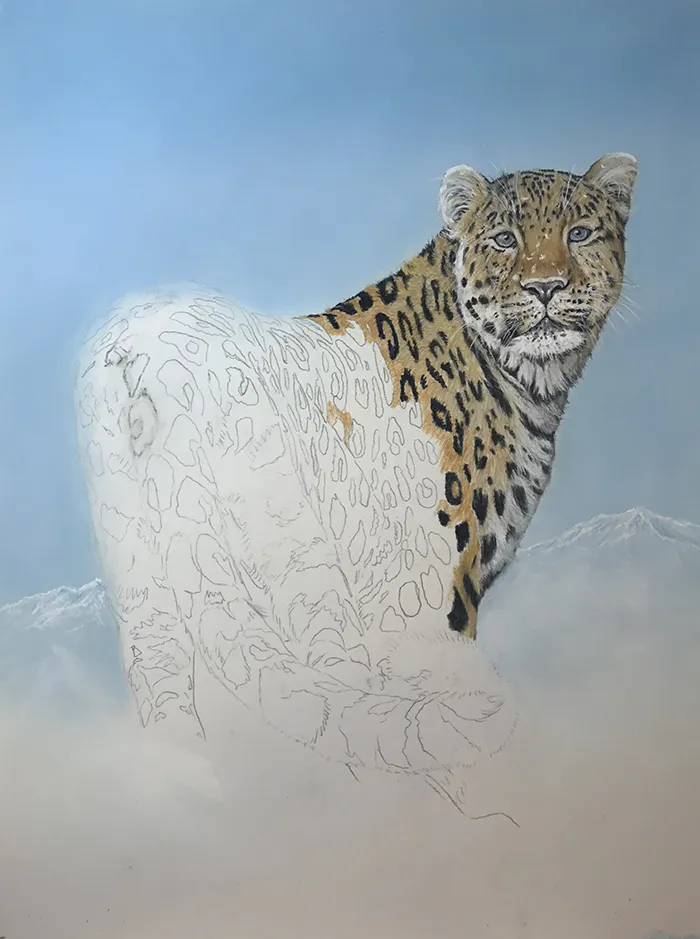 I've lightly sketched in the leopard, adding a PanPastel blue tint as a base for the background