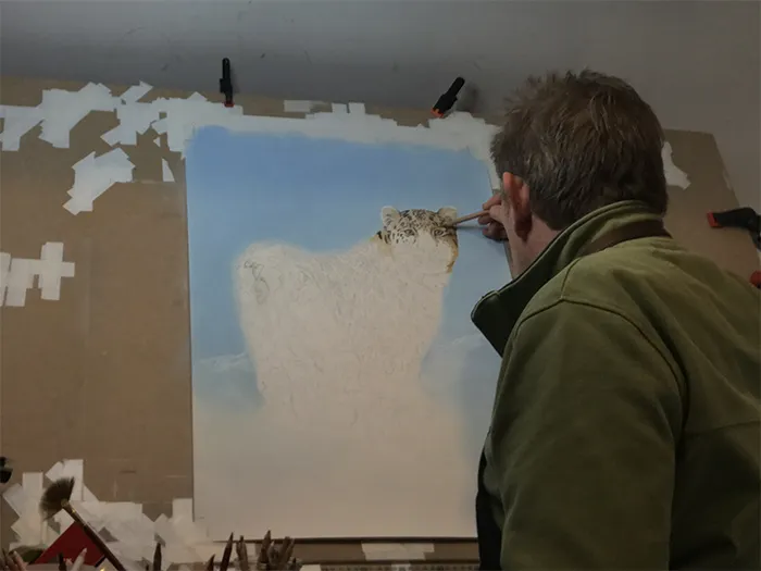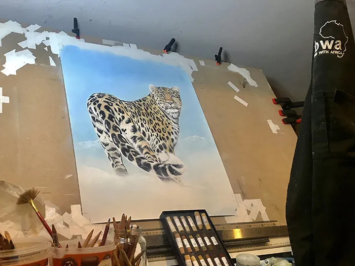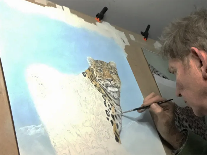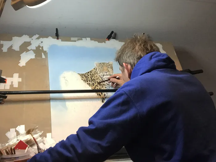 I'm adding the white highlights to the leopard's fur whilst using a bar to rest my wrist on