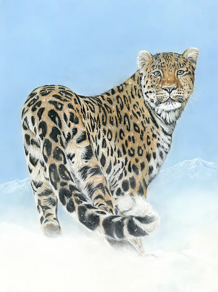 This is an image of a beautiful and rare Amur Leopard which I've sketched using Pastels on a white Clairefontaine paper whilst using a beautiful reference photograph licensed from Everlasting Photography.
