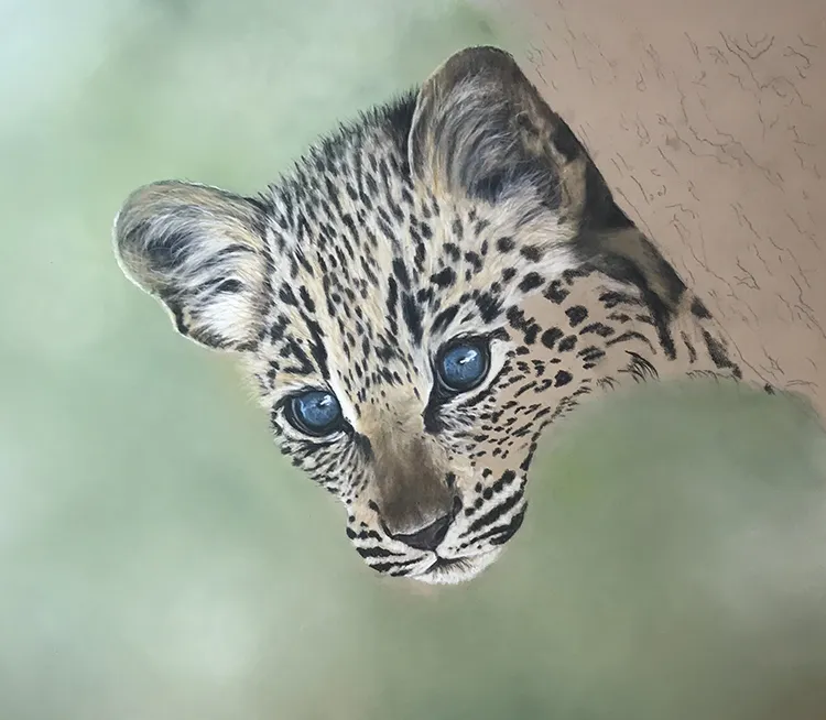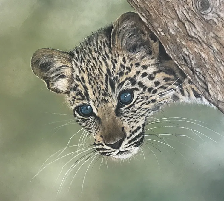 This is a painting of a very young leopard cub peeping from behind a tree trunk. The blueness of its eyes is due to the small deposit of melanin in the irises, which are the muscular rings around the pupils, making them appear blue.