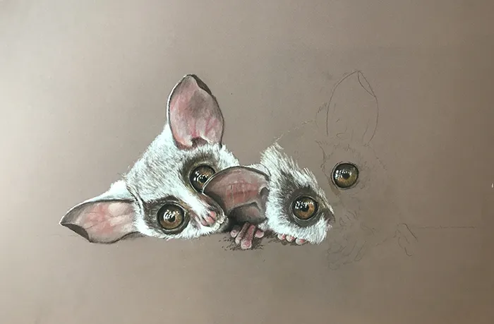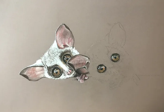 I started on their big eyes and then I've worked on the first bushbaby adding its large ears