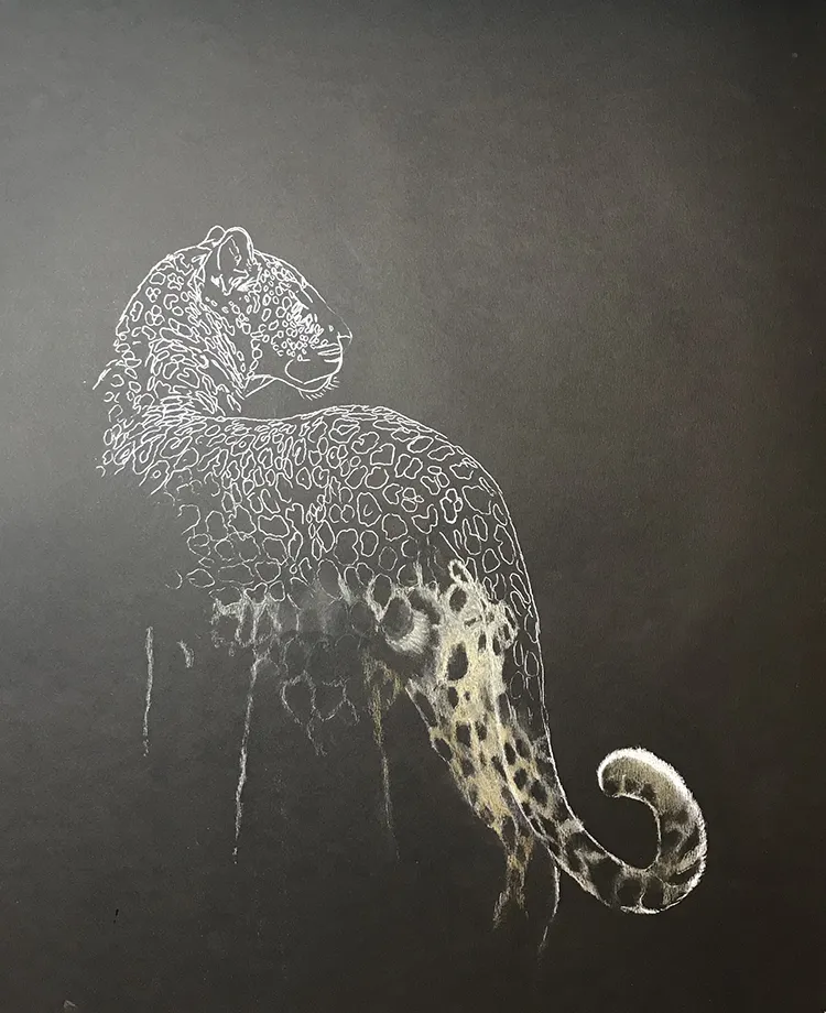 I've sketched this moonlit image of a female leopard as she pauses to look back