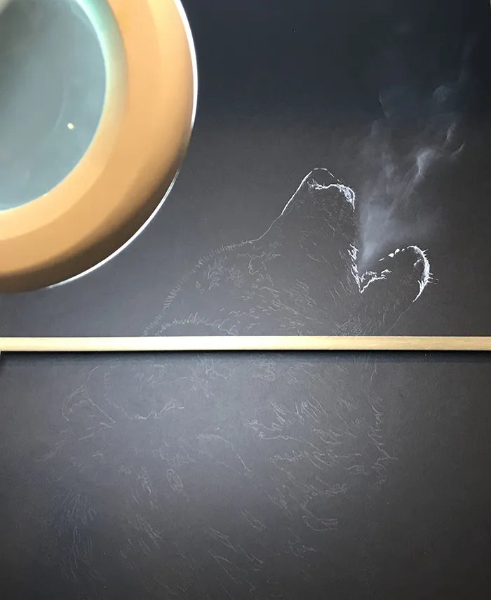 Working down the jaw line of the wolf.