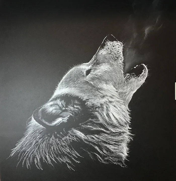 A sketch of a wolf using Chalk and Charcoal on black pastel paper.