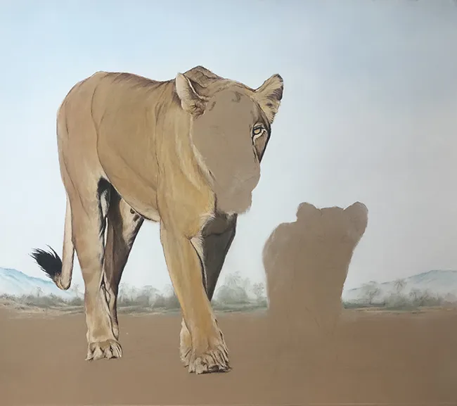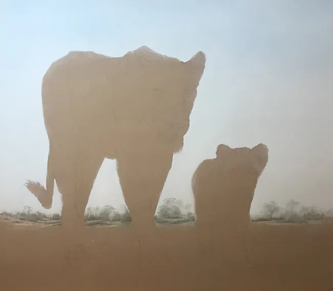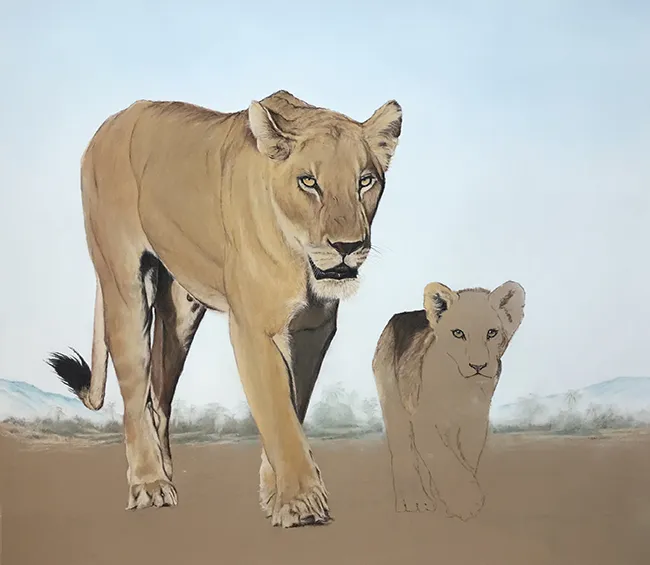 I've lightly pencilled in the image of the lioness and her cub in stride