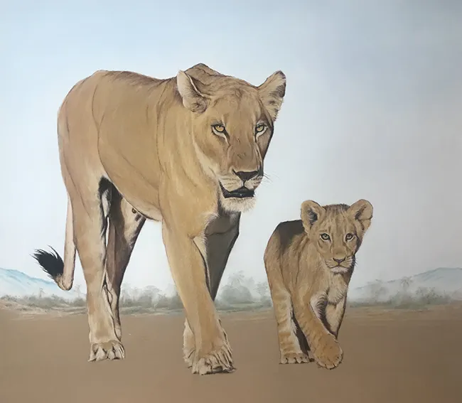 This is a sketch of a lioness with her cub as they walk in step along a ridge
