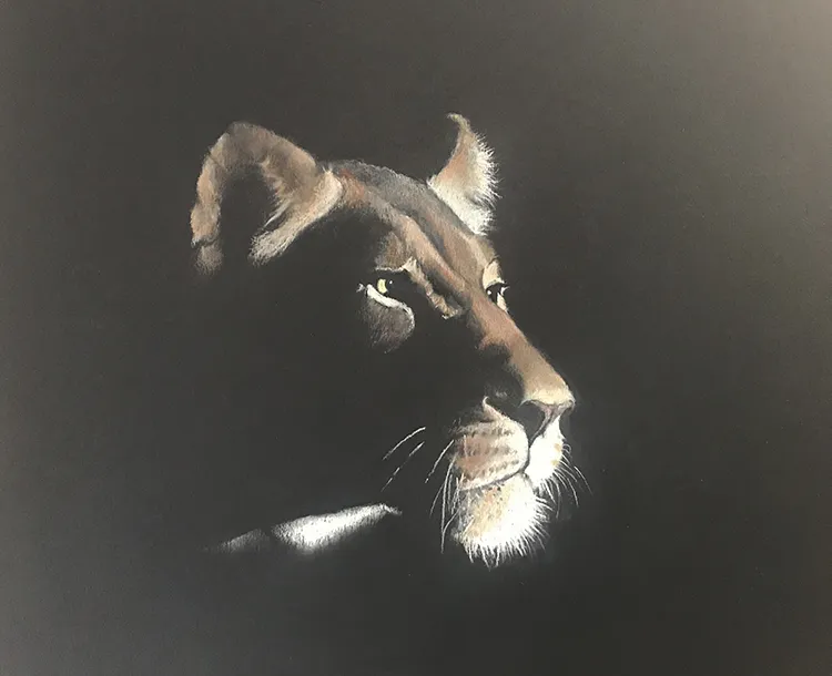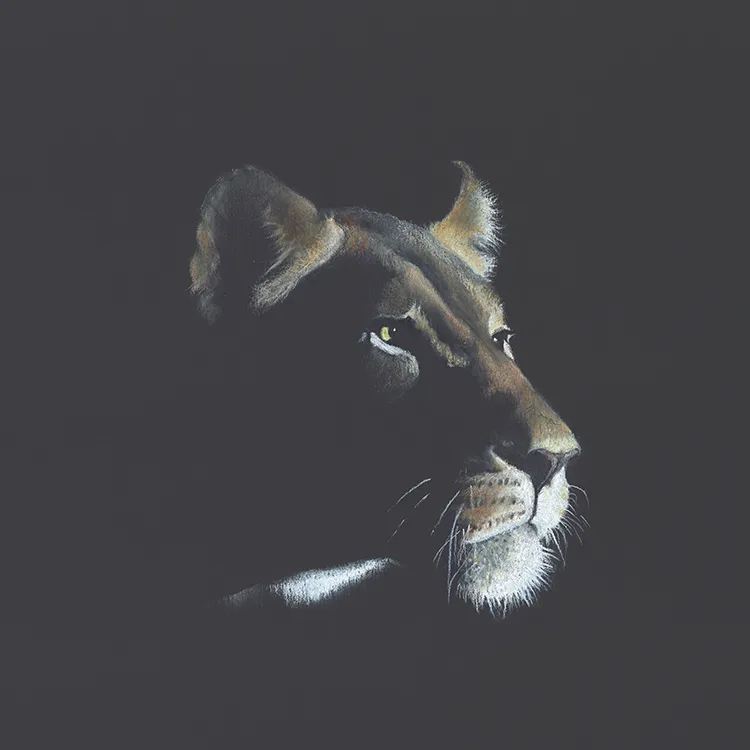 A lioness stares intently into the darkness