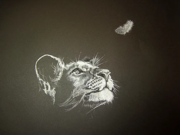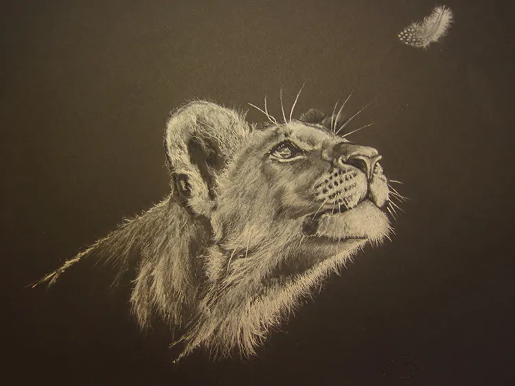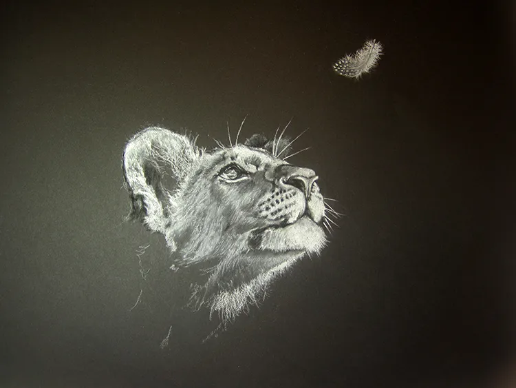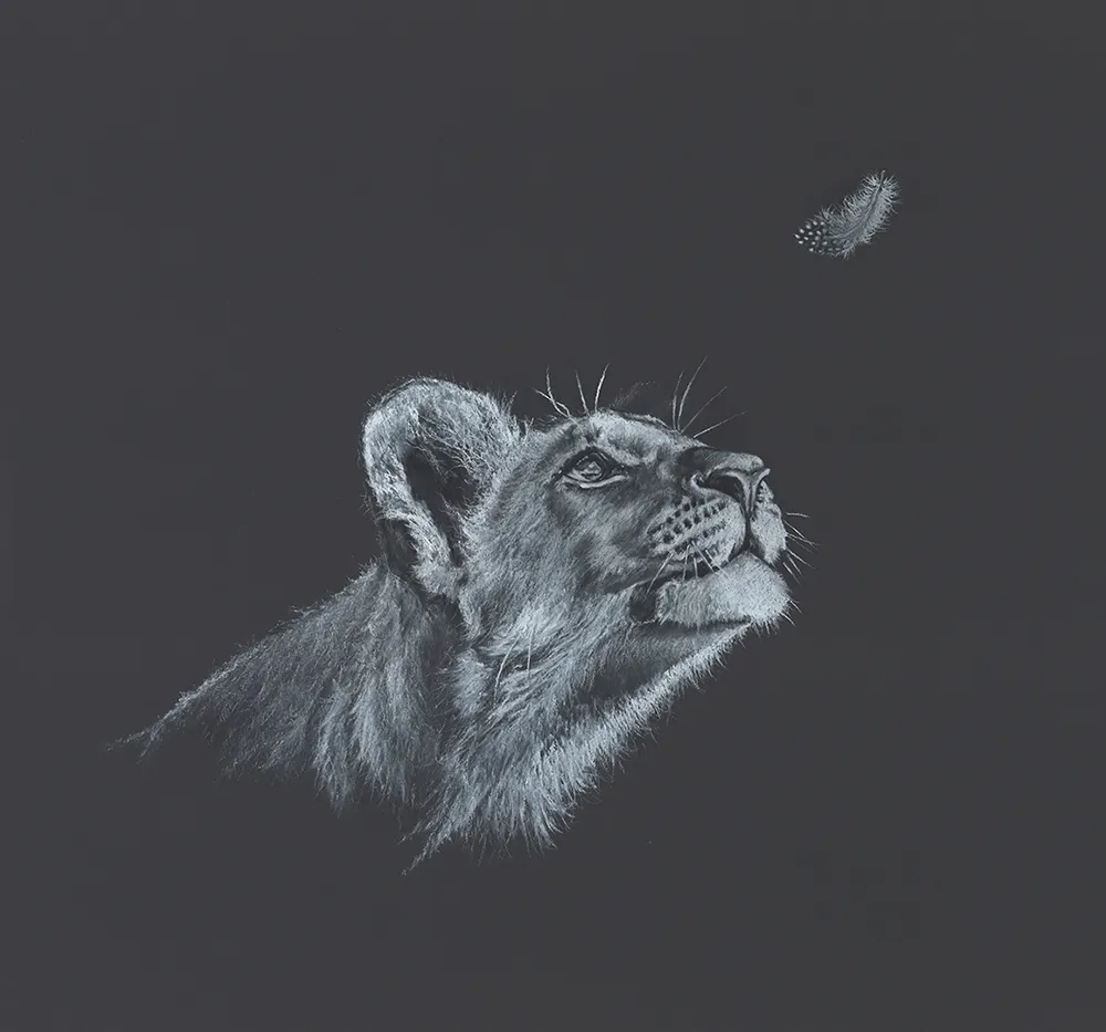 A lion cub spots a Guinea fowl feather)