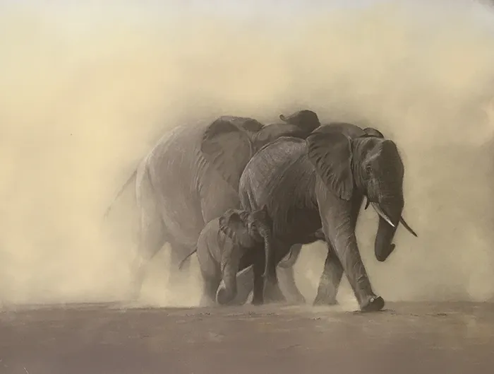 I'm at my easel working on some minor highlights on the baby elephants trunk