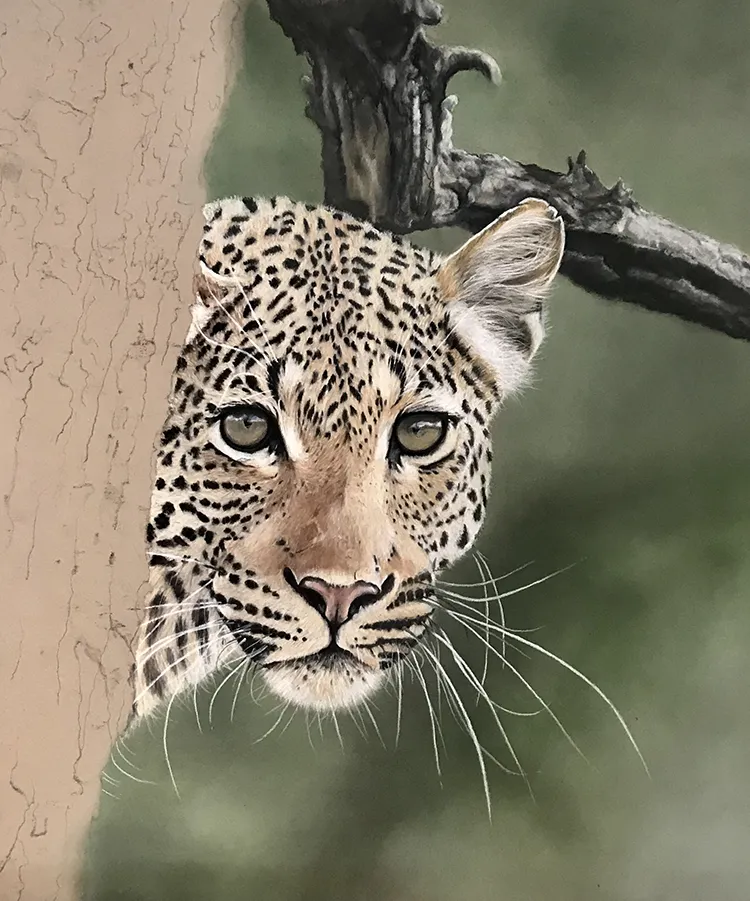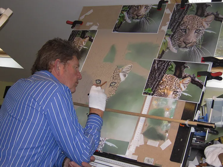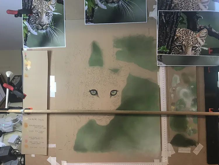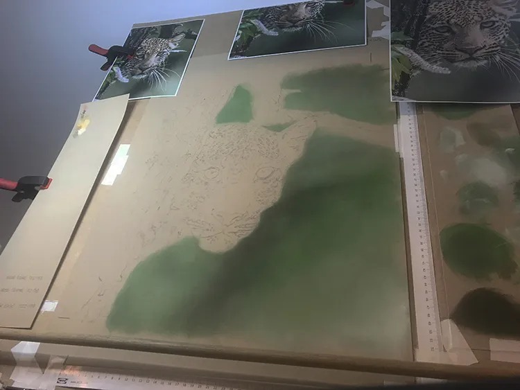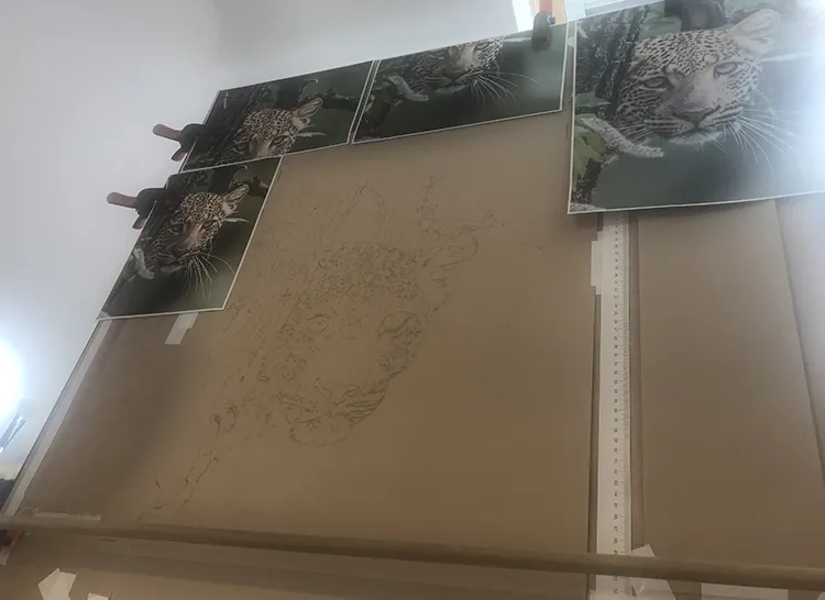 I'm now gradually filling in the very distinctive markings that every leopard has. Using my cross stick to rest my wrist.