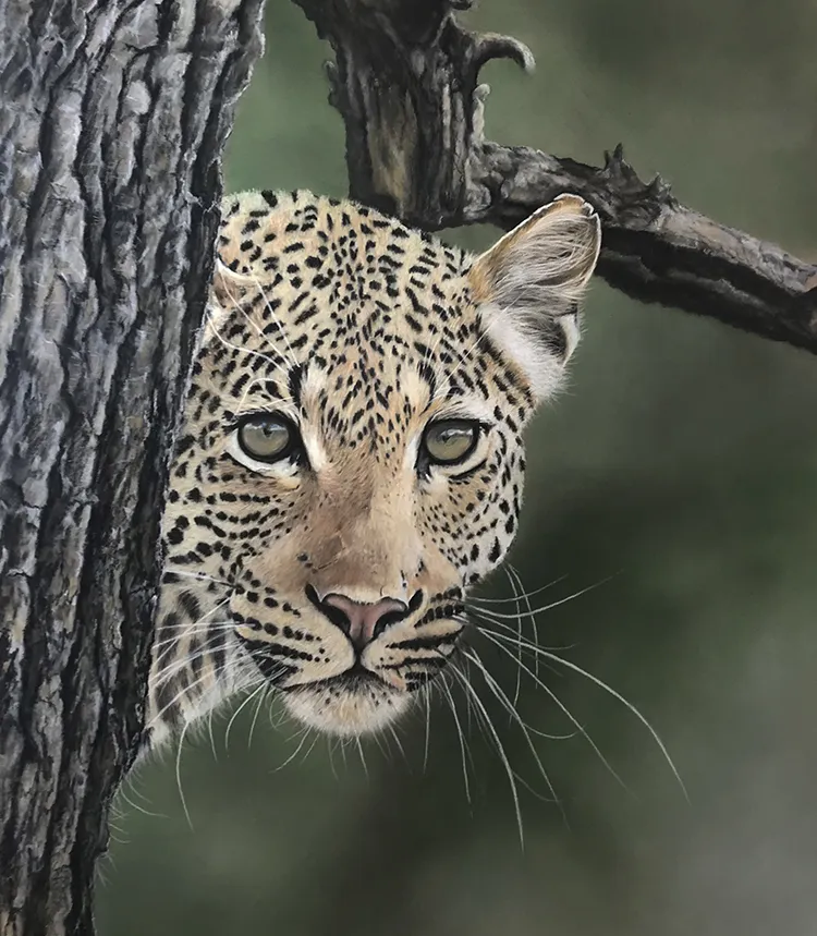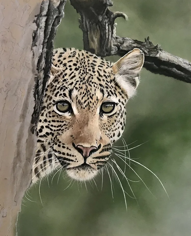 The gradual application of various shades of green pan pastel is used to create the dappling effect of the background