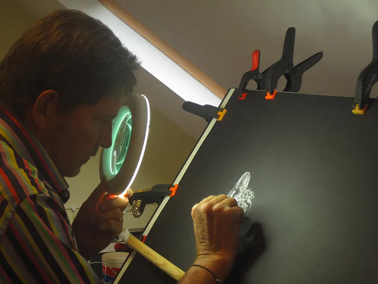 (She will be looking at a guinea fowl feather to her right)