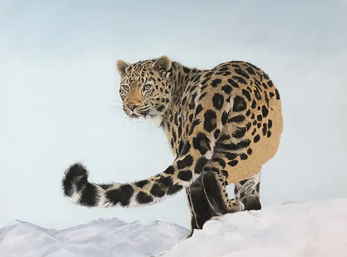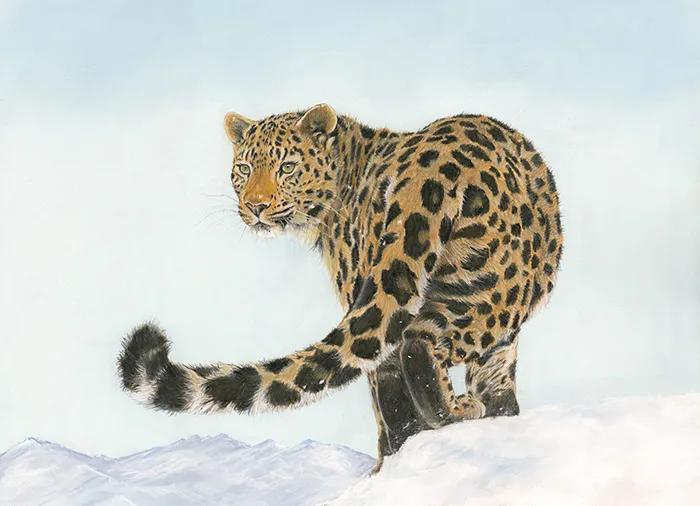 The Amur leopard is one of the rarest and most critically threatened leopard subspecies which is found along the borderlines of Russia and China. This image was sketched using Pastel on a Pastelmatt paper whilst referencing a beautiful photograph curtesy of wildlife photographer Matthew Roper.
