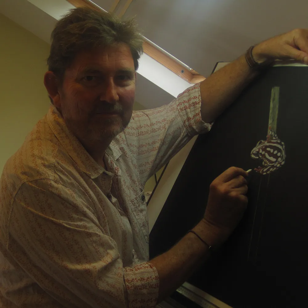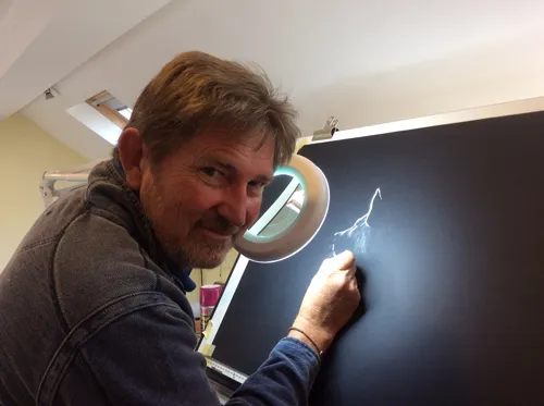 Simon sketching the image using a magnifying light and piece of CHALK.