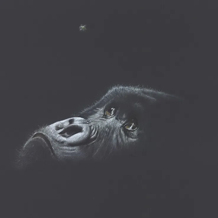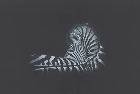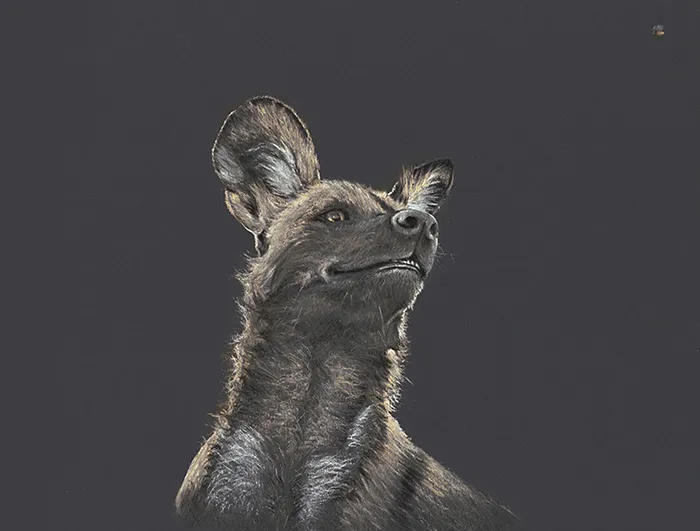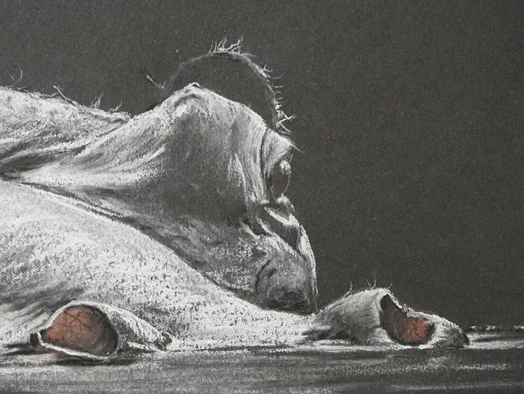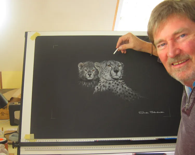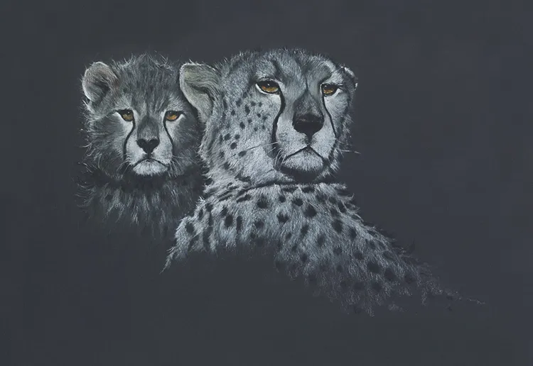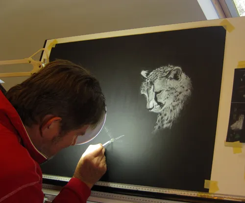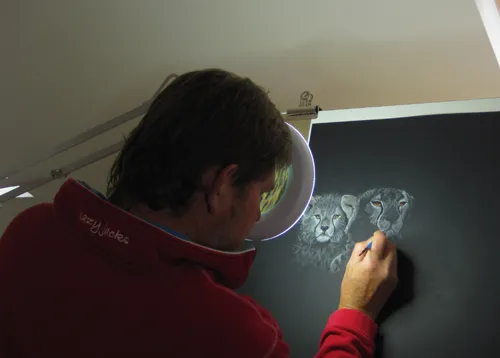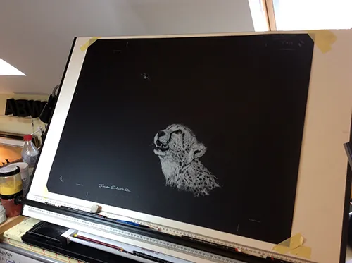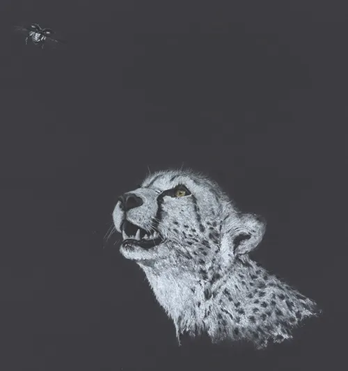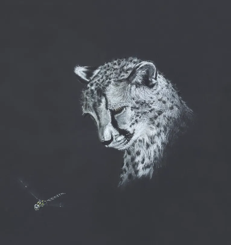 Work in Progress - A cheetah watches me sketch a dragonfly using chalk.