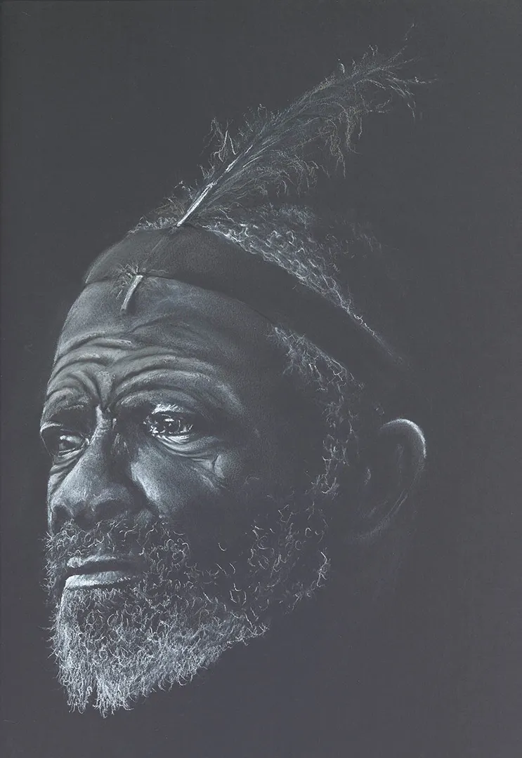 "Black on Black" on the board, signed and cropped