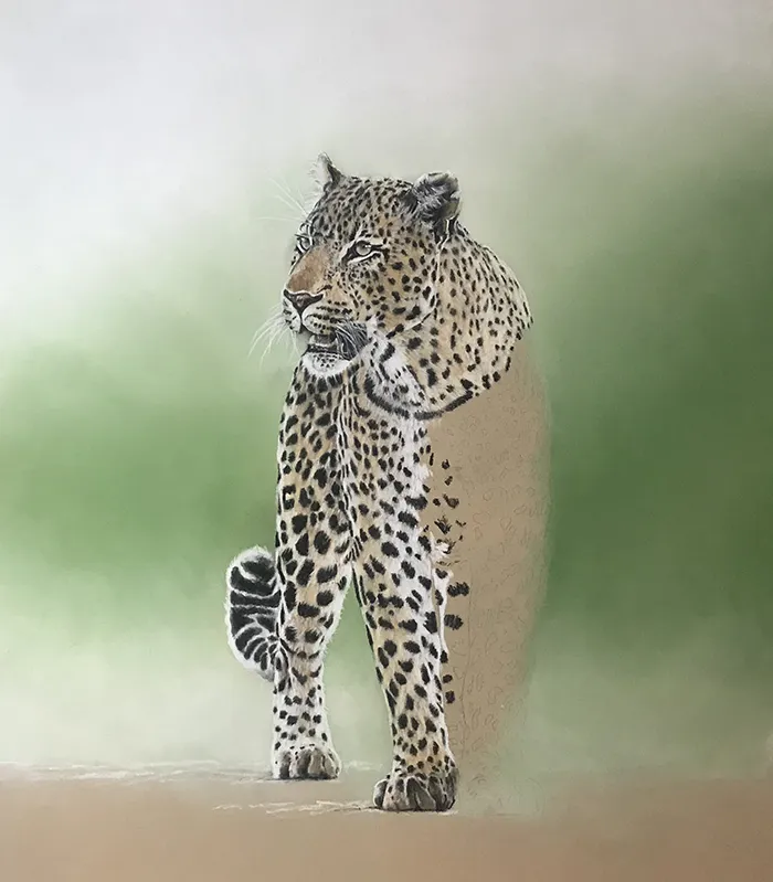 This sketch is an image of a beautiful male leopard taking a brief pause as it appears from out of the bush. I've sketched him using Pastel on a Clairefontaine paper.