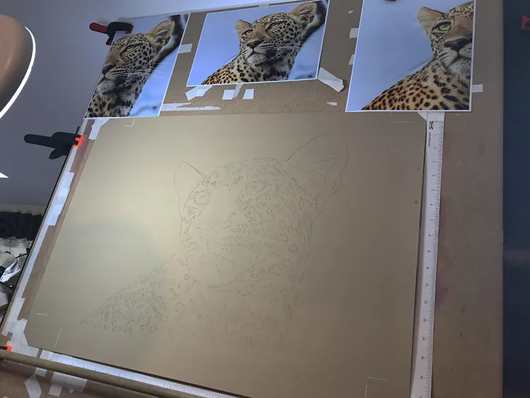 Both ears and eyes have been sketched in and now filling in the spots of the leopard.