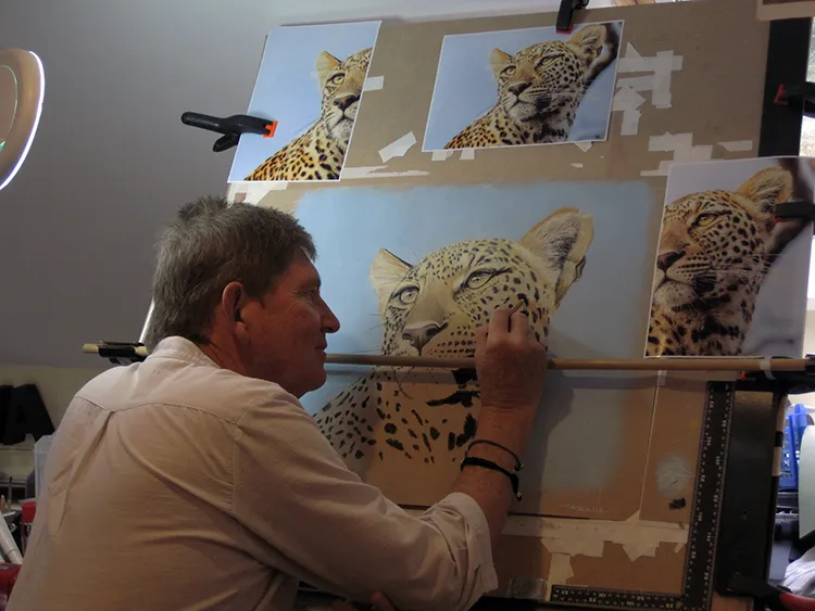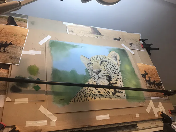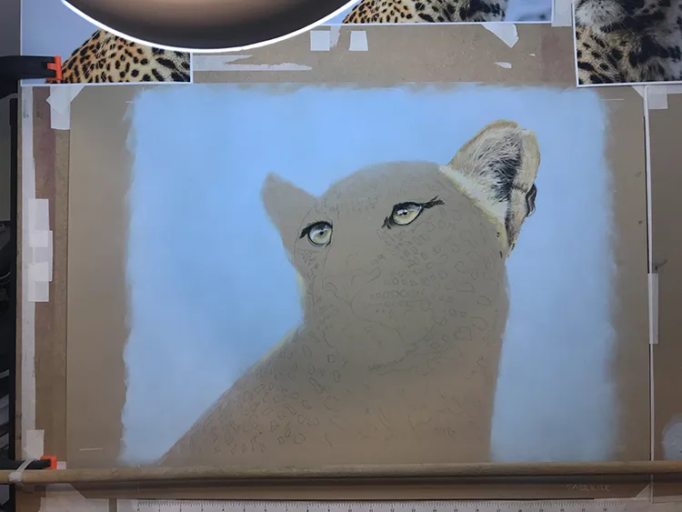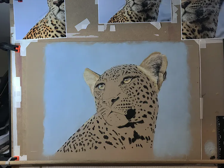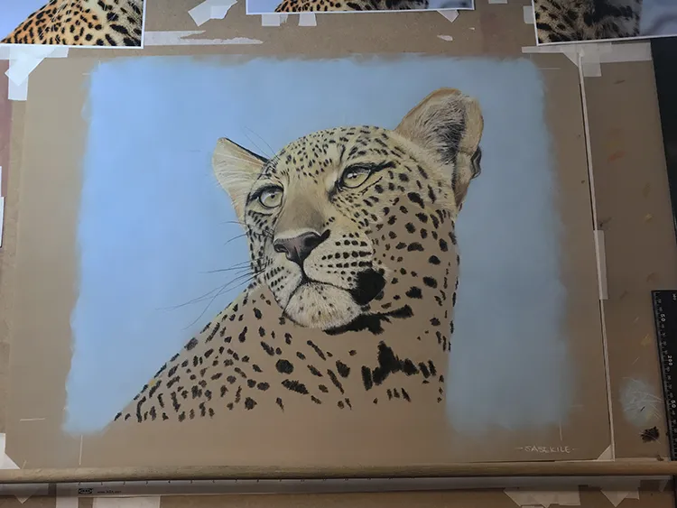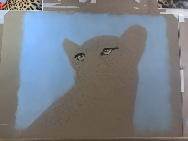 Gradually sponging in a Phthalo Blue Tint Pan Pastel for the sky which now outlines the leopard