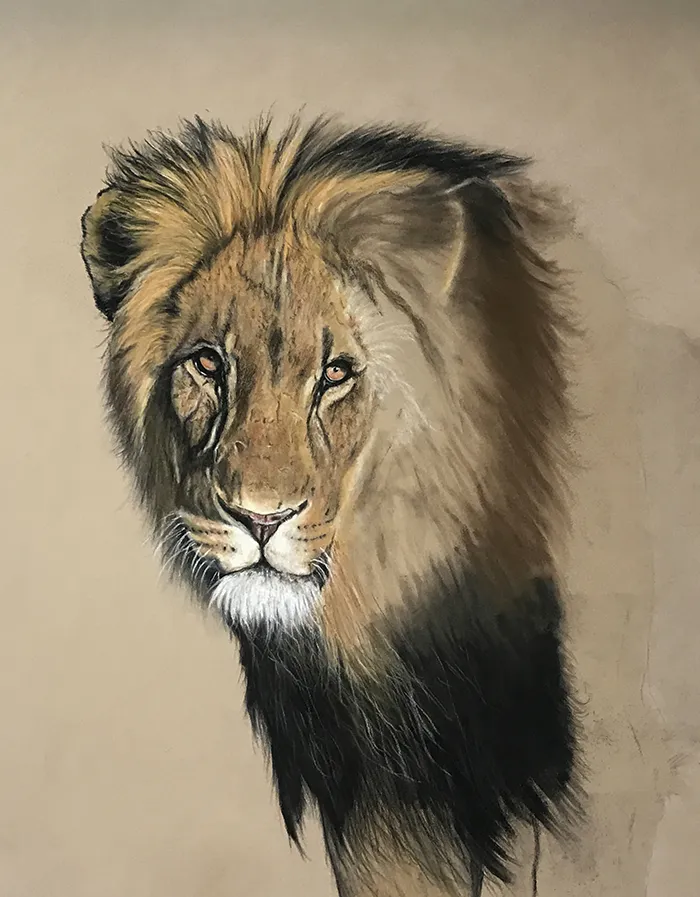This is an image of a large old black and golden maned lion which I have sketched in the medium of Pastel on a PastelMat paper whilst using a beautiful photograph courtesy of Freda Strydom.