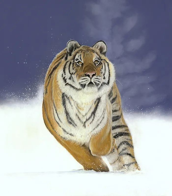 This image of an Amur Tiger exploding into a sudden charge has been sketched using the medium of soft and hard Pastels on a PastelMat paper.