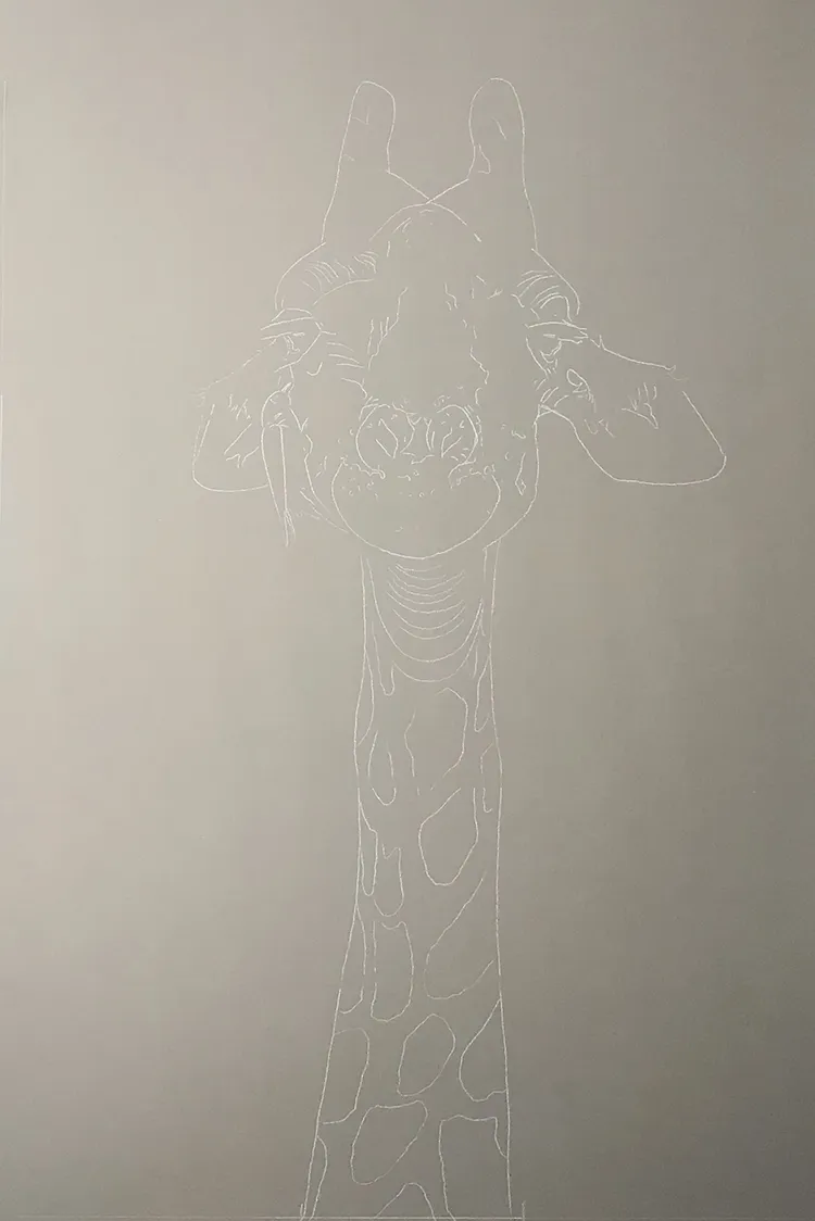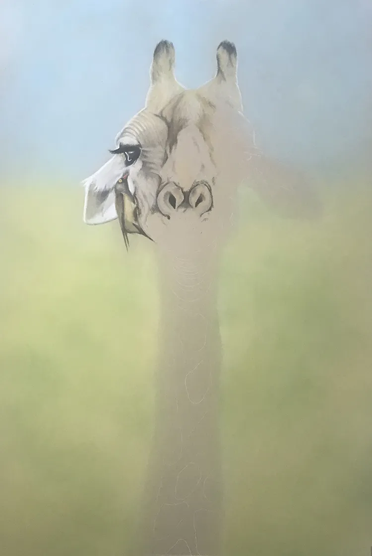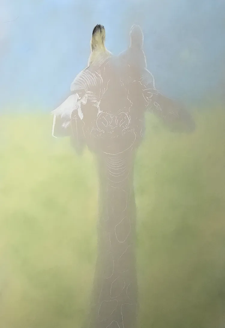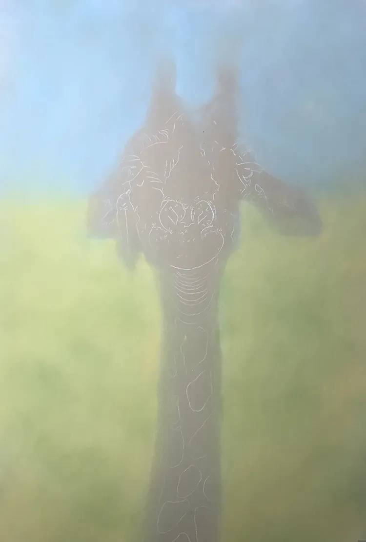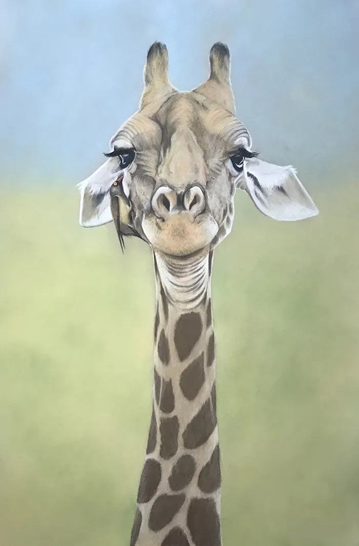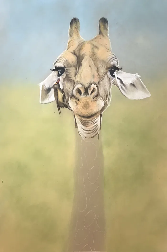 Working down the neck as I add the dappled colours, with the giraffe beginning to stand out from the background
