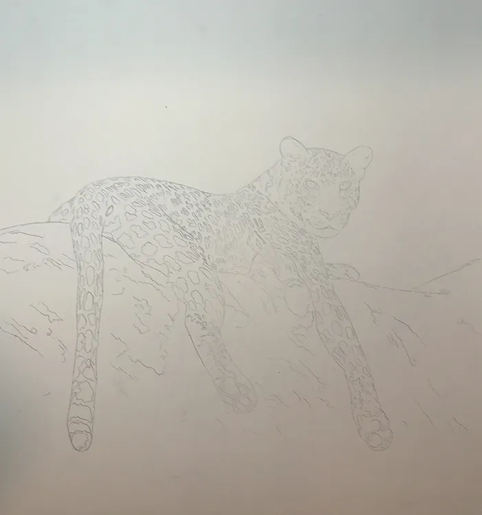 I began by lightly sketched in an outline of the leopard reclined on the large branch