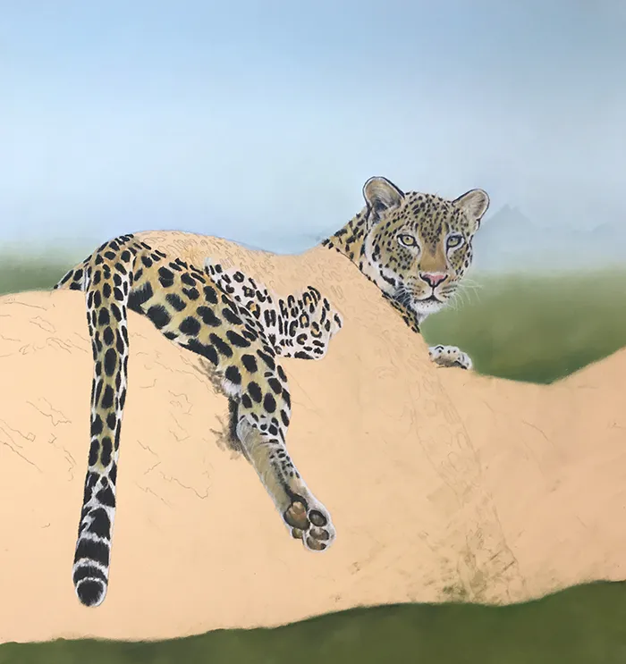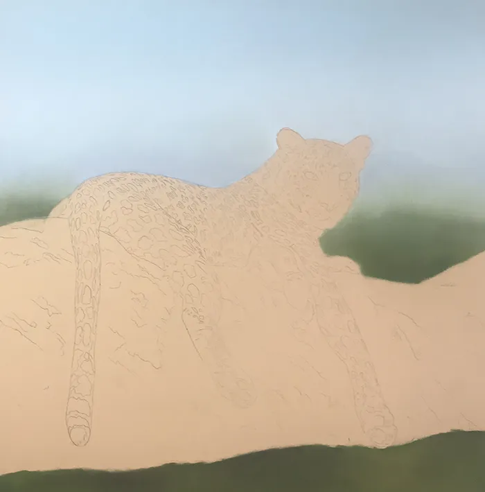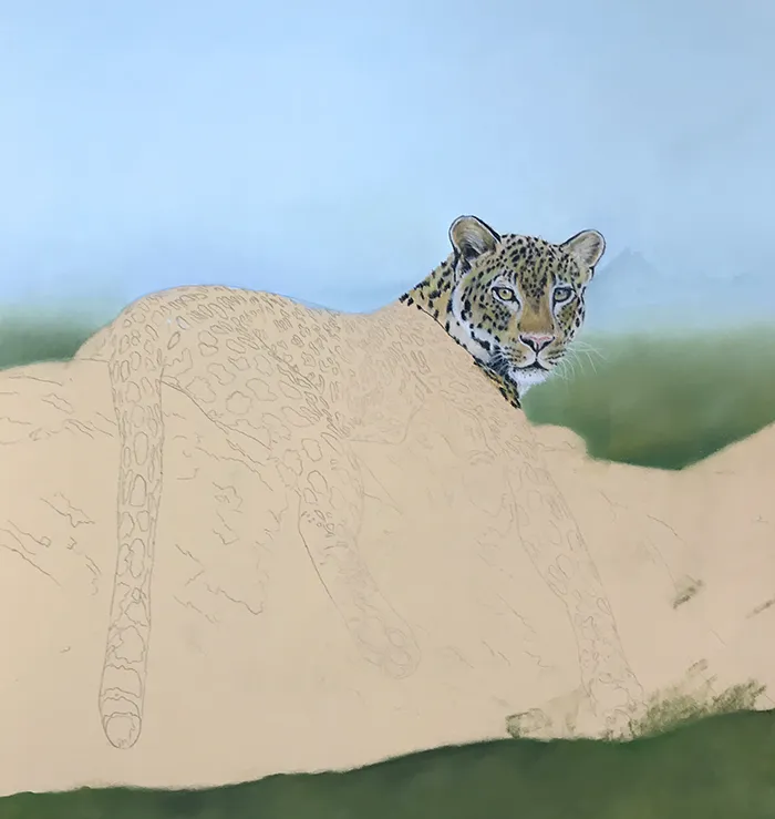 I then added a suggestion of tree tops below, before moving onto the leopard's face