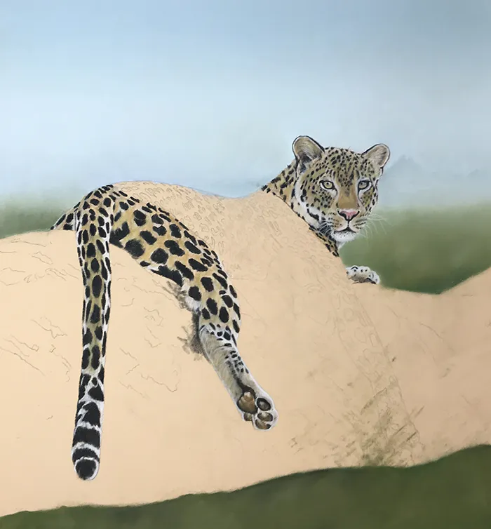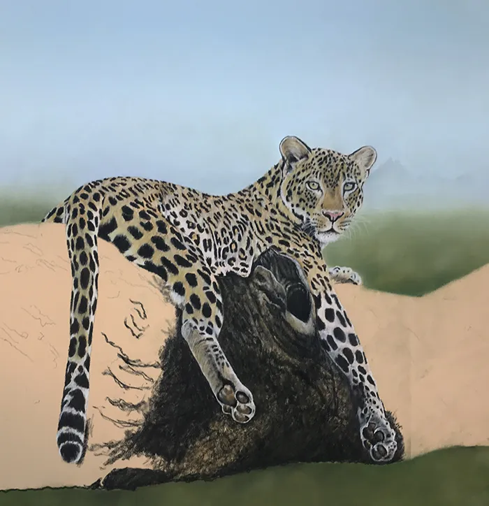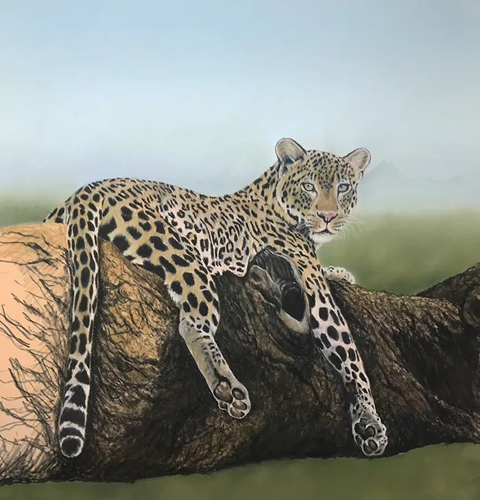 This image of a leopard reclined on a large branch with Mt Kilimanjaro in the background has been sketched in the medium of Pastels on a PastelMat paper whilst using a beautiful photograph courtesy of Tina Marie